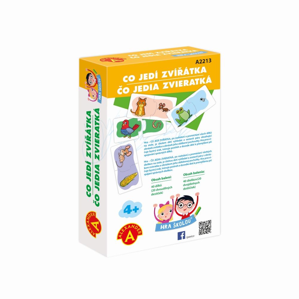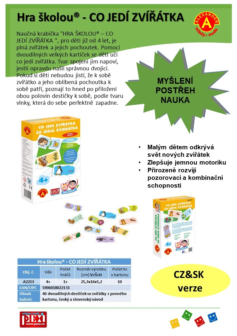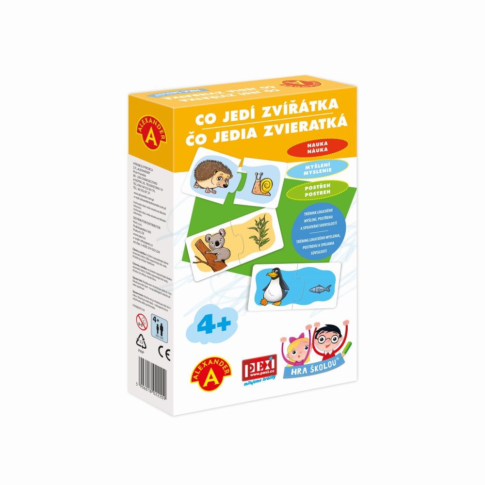 Naučné hraní pro malé zvědavce. Krabička "HRA ŠKOLOU® – CO JEDÍ ZVÍŘÁTKA ", pro děti od 4 let, je plná zvířátek a jejich pochoutek. Co jí ježek? Co mlsá koala? Spoj 20 zvířátek s jejich oblíbenou dobrotou a trénuj postřeh, paměť i zrak. Poznáš všech 20 zvířátek? Víš, co jim chutná? Sestav 20 párů zvíře + oblíbená dobrota a pokračuj ve hře podle své fantazie. Když váháš, spojuj dvojice podle barev. Mnoho variant hry. Až sestavíte dvojice, můžete třeba hledat býložravce, nebo doplňovat další dobroty, které zvířátkům chutnají. Proč jí koala jen jeden druh potravy? Je panda jen býložravec? Váháte? Poznávejte svět společně. Kolik nápadů, tolik variant. Jak dítě poroste, zvládne těžší a těžší úkoly.1. Pro nejmenší (od 4 let): Nechte dítě složit samostatně dvojice a prohlížet si obrázky.2. Střední obtížnost: Dávejte dítěti konkrétní úkoly, například najdi všechna zvířátka, která mají ráda maso.3. Těžší otázky pro chytré hlavičky: Ptejte se a společně zjišťujte třeba: Kolik zvířátek z obrázků žije v moři?Která zvířátka žijí v České republice?Co dalšího loví kočka/čáp/žába..Která zvířátka jedí pouze jeden druh potravy? Doba trvání hry:Záleží na vás. Stačí pár minut času a pevná podložka. Děti milují zvířátka a kladou zvídavé otázky. Připravte si k ruce raději encyklopedii nebo mobil s internetem :-) Bezpečnost na prvním místě:Dvojice kartiček o velikosti cca 10 × 5 cm jsou z pevného materiálu odolného proti rozlomení. Otírejte je vlhkým hadříkem bez jaru a dalších chemikálií a vzápětí vysušte. Obsah balení: 20 pevných kartiček rozdělených na poloviny s kreslenými motivy dvojic: osel + seno, lev + maso, veverka + oříšek, mravenečník + mravenec, koala + listy blahovičníku, panda + list bambusu, opice + banán, žába + moucha, včela + květ, ježek + hlemýžď, kráva + tráva, myš + kukuřice, čáp + kobylka, tučňák + ryba, stonožka + zelený keř, zajíc/králík + mrkev, pes + kost, slepice + zrní, pták + žížala, kočka + myš, dále uzavíratelný sáček + krabička s ukázkami kreslených motivů. Hlavní vlastnosti: rozvoj postřehu, fantazie i myšlení podporuje rozpoznávací schopnosti dětí i bystrý zrak zábava i pro dospělé k hraní kdykoli a kdekoli
