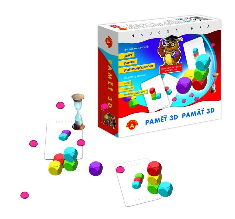 Naučná hra plná zábavy s barvami, prostorem a pamětí pro děti od 5 do 12 let a pro jejich rodiče (2-5 hráčů). Vyzkoušejte a trénujte svou prostorovou orientaci a zrakovou percepci, která je důležitá pro poznávání okolního světa a pro dobré zvládnutí učení písmen a znaků ve škole. Při hře si její účastníci také osvěžují poznávání barev a opakují počítání. Vhod přijde také procvičení paměti. Napětí jednotlivým kolům dodávají přesýpací hodiny, které určují čas na složení prostorového vzoru. Pro nejmladší hráče, můžete měření času vynechat a usnadnit jim tak hru. Úkolem hráče je zpaměti poskládat kostky do prostoru, podle vzoru na kartě, kterou si vytáhne z balíčku. Čas na položení odměřují přesýpací hodiny. Ten, kdo nejrychleji uloží kostky podle zapamatovaného vzoru, získává žeton. Vyhrává ten hráč, který má na konci hry nejvíce žetonů. Zvolte si OBTÍŽNOST: Poskládat barevné kostičky do prostoru nemusí být snadné, jak se na první pohled zdá. Proto hra umožňuje zvolit karty podle různé obtížnosti a přizpůsobit jí věku hráčů zapojených do hry. Z hraní hry Paměť 3D se tak pokaždé stane skutečná zábava.Pokud jste starší nebo dospělí, můžete si zvolit kartu se složitějšími vzory. Uvidíte jak jste na tom s prostorovým vnímáními svým pamatovákem! :-) Velikost kostek je 1,8 cm. Balení obsahuje: barevné kostky v 5 barvách– 25 kskarty vzorů – 55 kspřesýpací hodiny – 1 ksžetony – 100 ksčeský a slovenský návod – 1ks Hlavní vlastnosti: trénuje postřeh a paměťučí barvy a prostorovou představivost Dokumentace: návod ke hře CZnávod ke hře SK