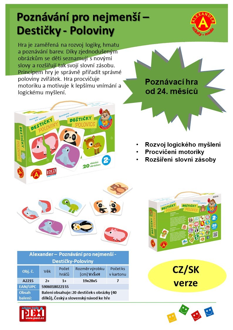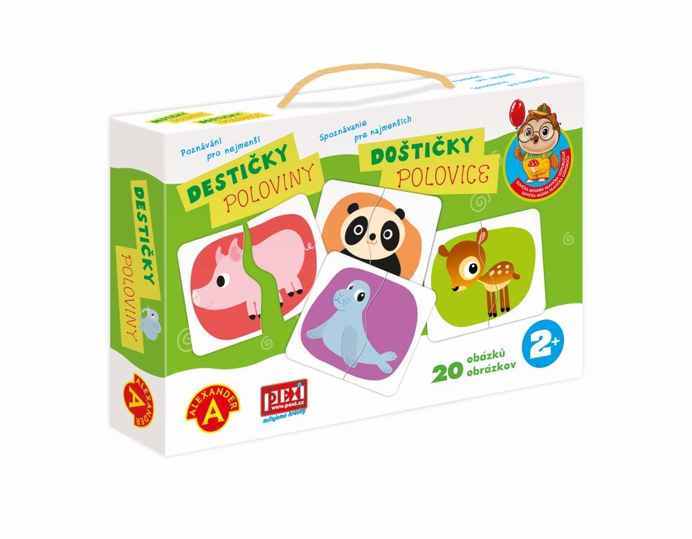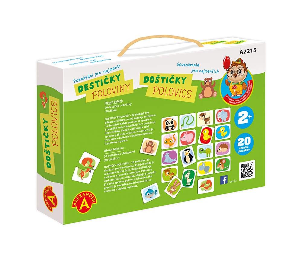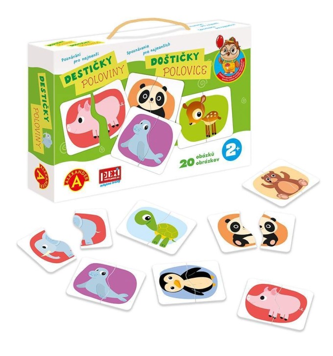 Jednoduchá, poznávací a naučná hra, která rozvíjí schopnosti batolat od 24. měsíců věku. Hra ze série "Sovička moudrá hlavička". Hra je zaměřená na rozvoj logiky, hmatu a poznávání barev. Díky zjednodušeným obrázkům se děti seznamují s novými slovy a rozšiřují tak svojí slovní zásobu. Principem hry je správně přiřadit správné poloviny zvířátek. Hra procvičuje motoriku a motivuje k lepšímu vnímání a logickému myšlení. Garantem poznávacích her je uznávaná psycholožka z varšavské univerzity Alexandra Petrovská. Hra je vhodná pro děti od 2 do 3 let. Obsah balení: 20 destiček s obrázky z pevného kartonu (40 dílků), Český a slovenský návod ke hře, pevnou krabici s uchem pro snadné přenášení.