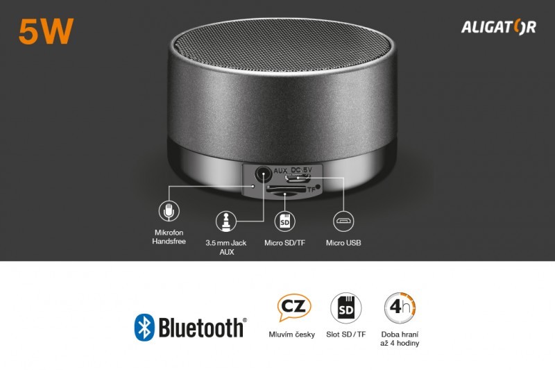 Přenosný Bluetooth reproduktor s výkonem 5W, micro SD, AUX a funkcí Handsfree s hlasovým menu v ČESKÉM JAZYCE!!!