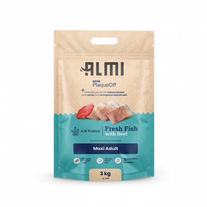 Granule ALMI Maxi Adult nabízí komplexní výživu díky vyváženému složení s 71 % živočišného proteinu. Obsahují čerstvé rybí maso ze sledě a hovězí maso, doplněné o hrách, jablka a řepnou vlákninu. Neobsahují žádná přidaná umělá barviva a jsou přirozeně konzervovány rozmarýnovým extraktem. Rýže pak zajišťuje dobrou stravitelnost krmiva. Granule ALMI jsou obohacené o PlaqueOff™, u kterého je klinicky prokázáno, že snižuje zubní plak, zubní kámen a zlepšuje špatný dech.
