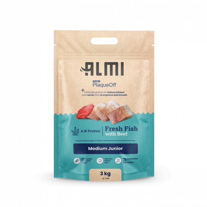 Granule ALMI jsou plné kvalitních surovin, které štěně potřebuje pro zdravý růst a vývoj. Obsahují čerstvou rybu, konkrétně sledě a hovězí maso, které jsou zdrojem bílkovin potřebných pro pevné a silné svaly. Dále je v krmivu hrách, jablka, řepná vláknina a rýže pro lepší stravitelnost. V našem krmivu nenajdete umělá barviva a pro zachování čerstvosti a kvality je přirozeně konzervováno rozmarýnovým extraktem. Granule ALMI jsou obohacené o PlaqueOff™, u kterého je klinicky prokázáno, že snižuje zubní plak, zubní kámen a zlepšuje špatný dech.