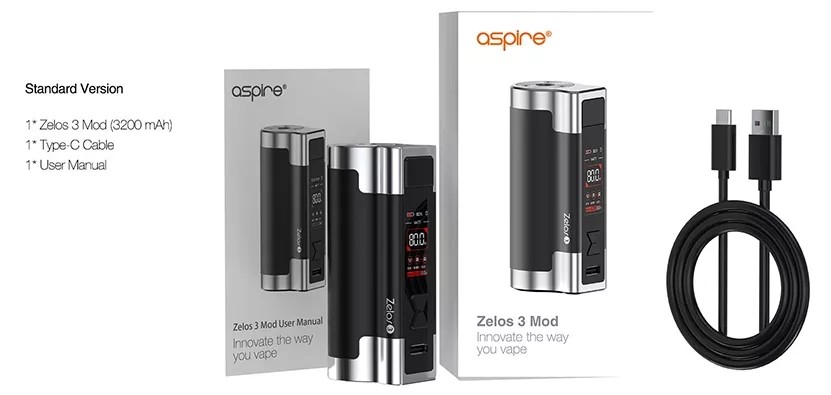 Výkonný samostatný Mod Aspire Zelos 3, vyrobený z lehké zinkové slitiny, disponující vestavnou baterií s vynikající kapacitou 3200mAh. Rozměry: 81mm x 38mm x 28mm, nastavitelný výkon: 1W-80W, nastavitelné napětí: 0,5V-8,4V, nastavitelná teplota: 100°C-315°C / 200°F-600°F, podporované režimy: VW/VV/Bypass/TC/TCR/CPS, integrovaná baterie: 3200mAh, nabíjení: USB-C (5V/2A), závit: 510 a odpružený kontakt, výrobce: Aspire, barva: Black (Černá).