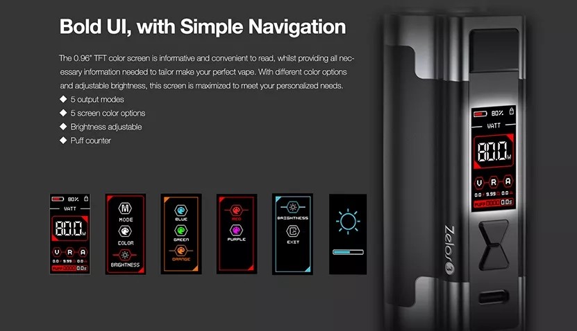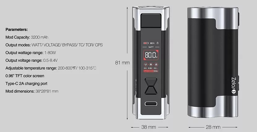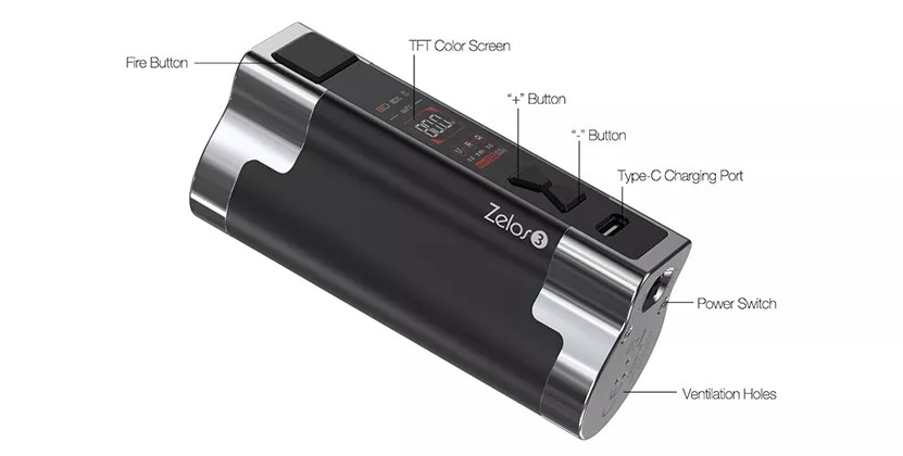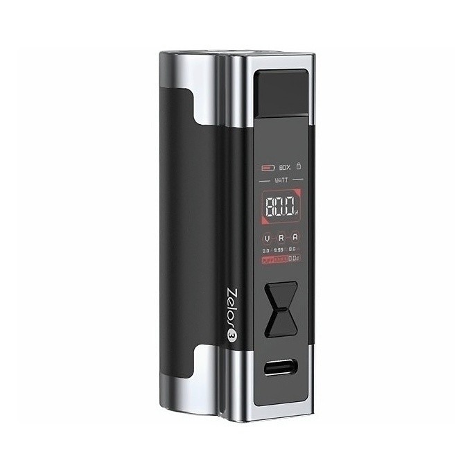 Výkonný samostatný Mod Aspire Zelos 3, vyrobený z lehké zinkové slitiny, disponující vestavnou baterií s vynikající kapacitou 3200mAh. Rozměry: 81mm x 38mm x 28mm, nastavitelný výkon: 1W-80W, nastavitelné napětí: 0,5V-8,4V, nastavitelná teplota: 100°C-315°C / 200°F-600°F, podporované režimy: VW/VV/Bypass/TC/TCR/CPS, integrovaná baterie: 3200mAh, nabíjení: USB-C (5V/2A), závit: 510 a odpružený kontakt, výrobce: Aspire, barva: Black (Černá). Celý popis