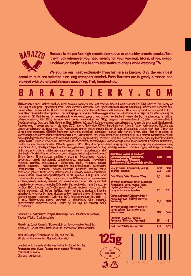 Objevte jedinečný zážitek delikátního sušeného vepřového masa Barazzo! Ručně vybírané prvotřídní kousky vepřového masa, mistrovsky ochucené originální směsí koření Barazzo, nabízí nejen vysoký obsah bílkovin, ale i neuvěřitelnou křehkost, která překonává tradiční sušené hovězí. Nechte se unést jedinečnou chutí a jemností každého kousku, pečlivě vysušeného na vzduchu pro dokonalý zážitek.