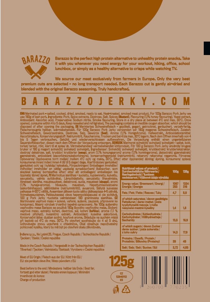 Prémiové sušené vepřové maso. Ochutnejte autentickou chuť Baden-Württemberska. Balení obsahuje 8 x Barazzo Jerky Pork Honey Mustard 125g. Baleno v kartonové krabici. Celý popis