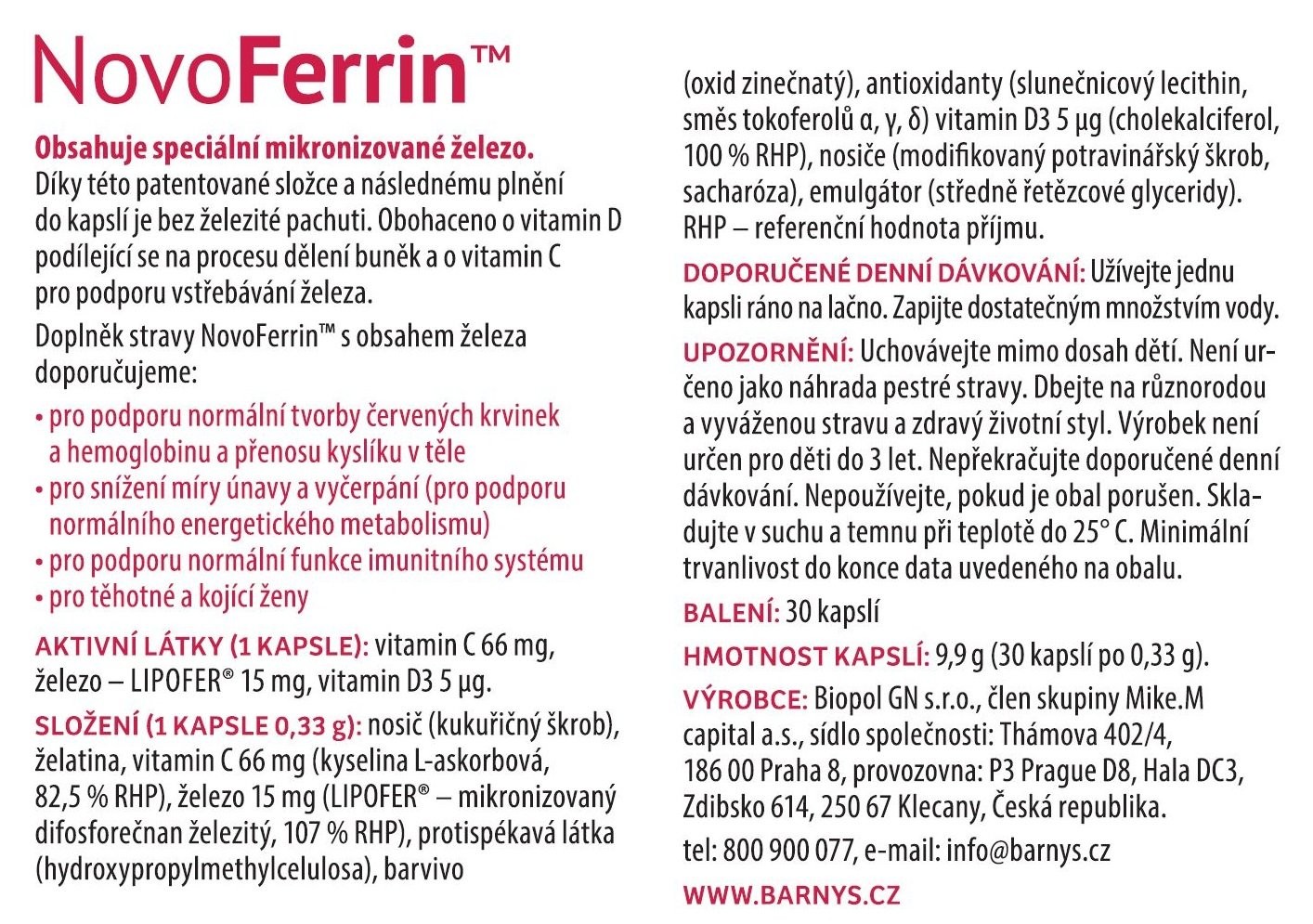 Složení (1 kapsle 0,33 g): nosič (kukuřičný škrob), želatina, vitamin C 66 mg (kyselina L-askorbová, 82,5 % RHP*), železo 15 mg (LIPOFER® – liposomální difosforečnan železitý, 107 % RHP*), protispékavá látka (hydroxypropylmethylcelulosa), barvivo (oxid zinečnatý), antioxidanty (slunečnicový lecithin, směs tokoferolů α, γ, δ), vitamin D3 5 μg (cholekalciferol, 100 % RHP*), nosiče (modifikovaný potravinářský škrob, sacharóza), emulgátor (středně řetězcové glyceridy).