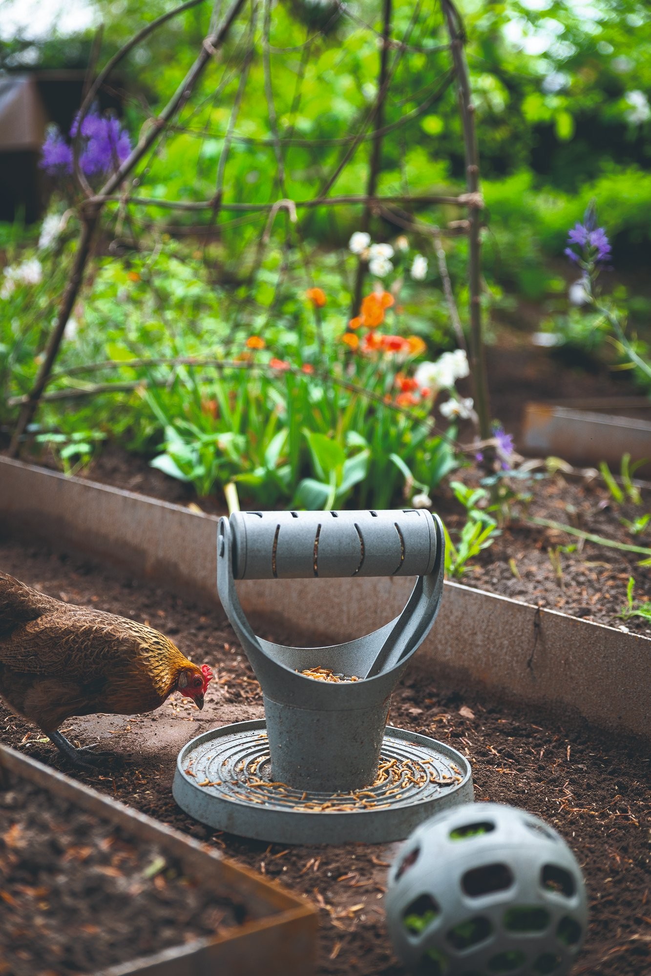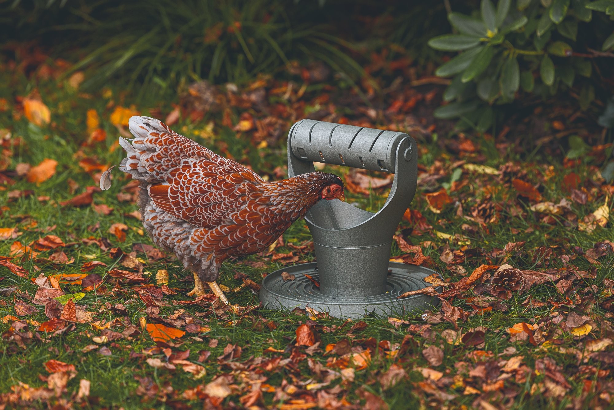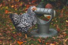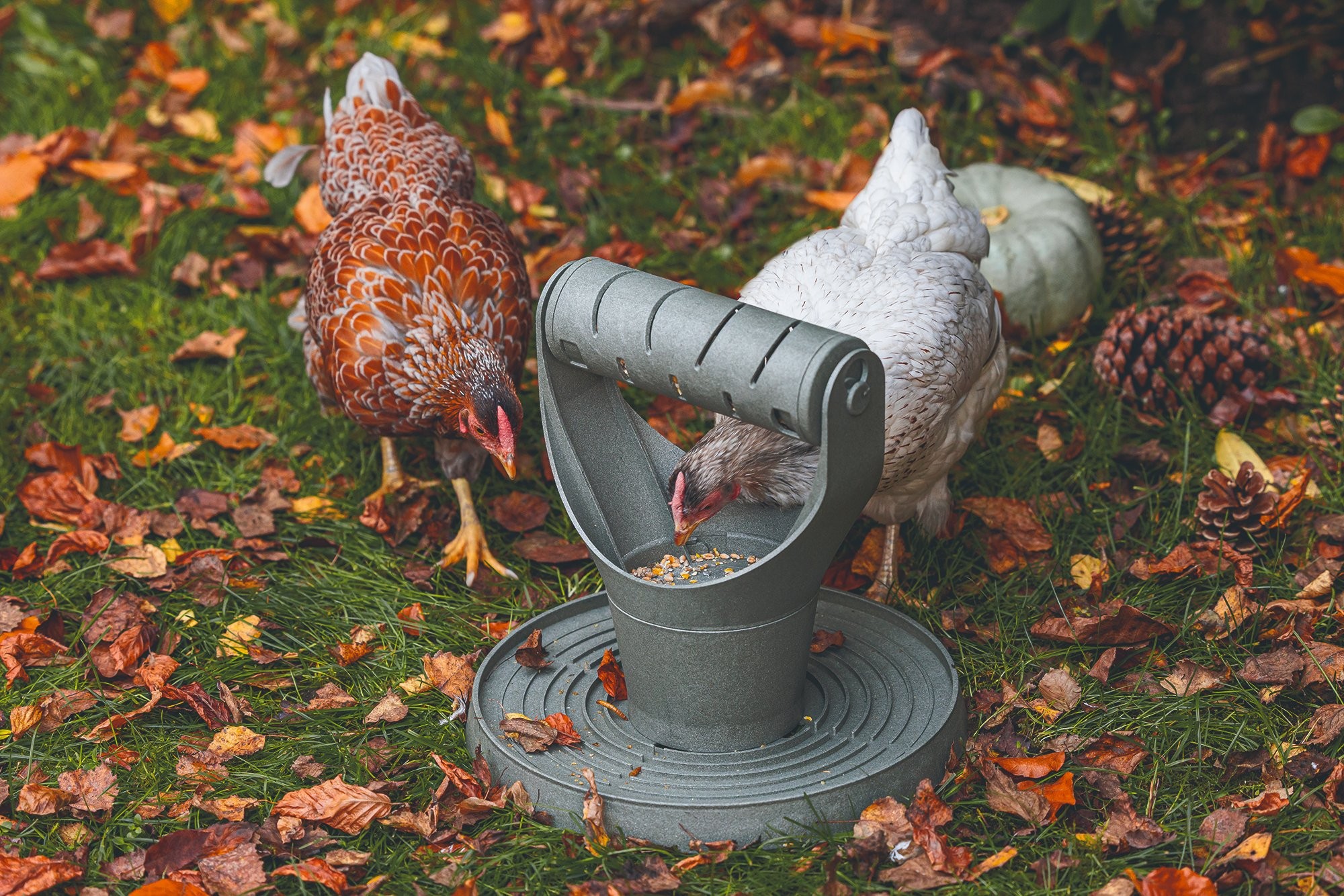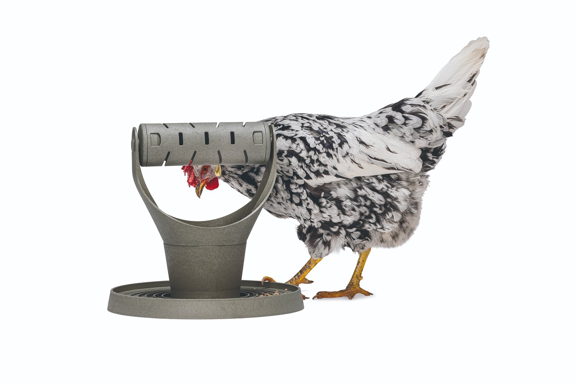 Krmicí věž nabízí kuřatům a slepicím i zábavnou výzvu v podobě otáčivého válce, který lze naplnit krmivem. Pokud do něj správně klovnou, budou okamžitě odměněny.