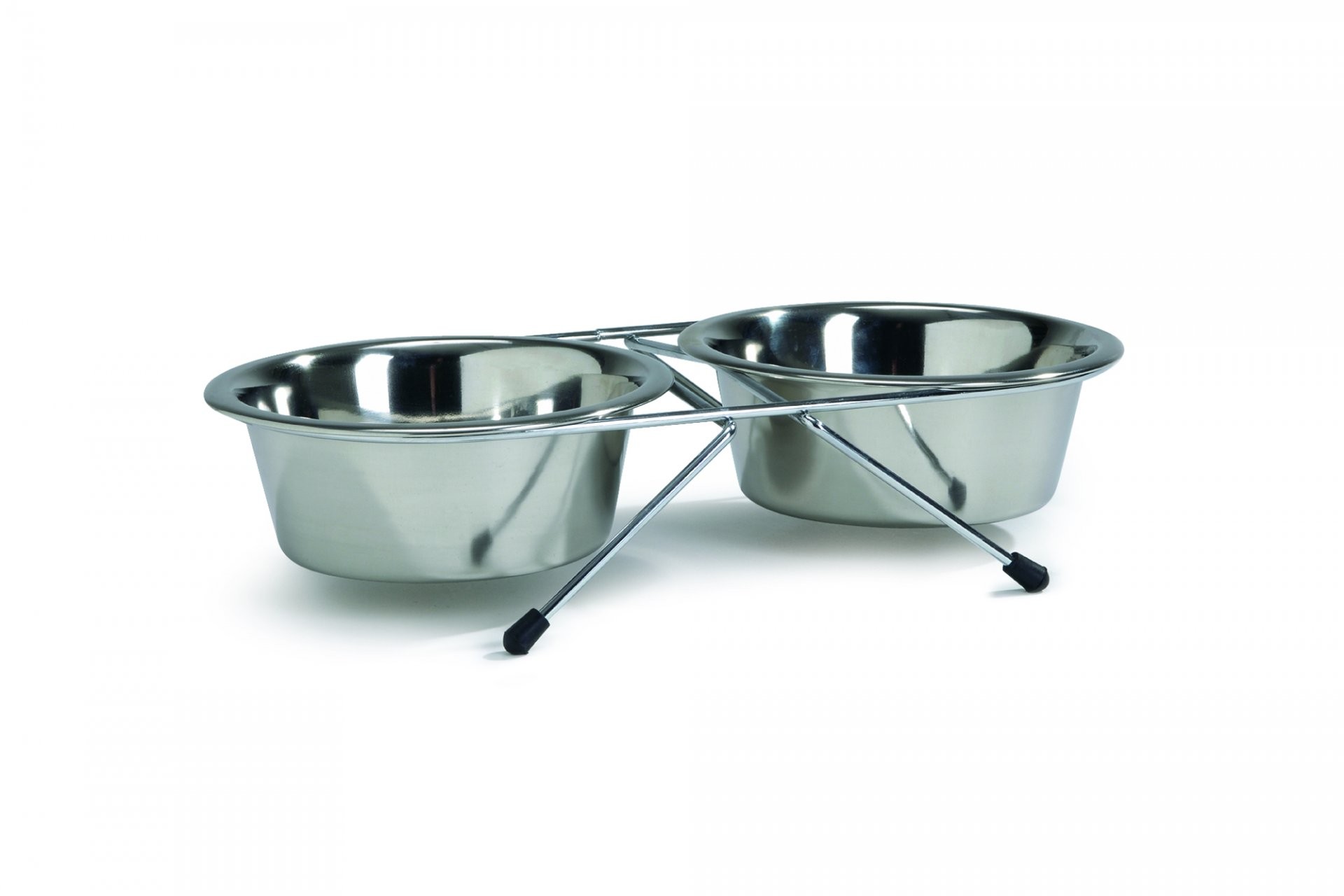 Nerezový stojánek se dvěma miskami pro psy. Celý popis