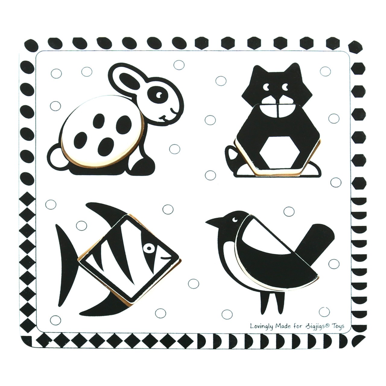 Toto dřevěné puzzle bylo speciálně navrženo v černé a bílé barvě, protože černá a bílá jsou pro nejmenší děti nejsnáze rozeznatelné a reagují na ně. Každý ze čtyř dílků puzzle lze zasunout do místa na desce s ilustrací zvířat a pomůže vašemu dítěti ve vývoji, když se naučí každý z nich identifikovat a umístit. Každý masivní dřevěný dílek puzzle má velkorysou velikost, aby ho malé ručičky snáze zvedly, uchopily, prozkoumávaly a vyměňovaly. Pomáhá rozvíjet zručnost, smyslové dovednosti a koncentraci. Vyrobeno z vysoce kvalitních, zodpovědně získaných materiálů. Splňuje aktuální evropské bezpečnostní normy. Obsahuje 4 dílky puzzle. Hlavní vlastnosti: speciálně navrženo pro nejmenší dětiobsahuje 4 dílky puzzlerozvíjí zručnost, smyslové dovednosti a koncentraci