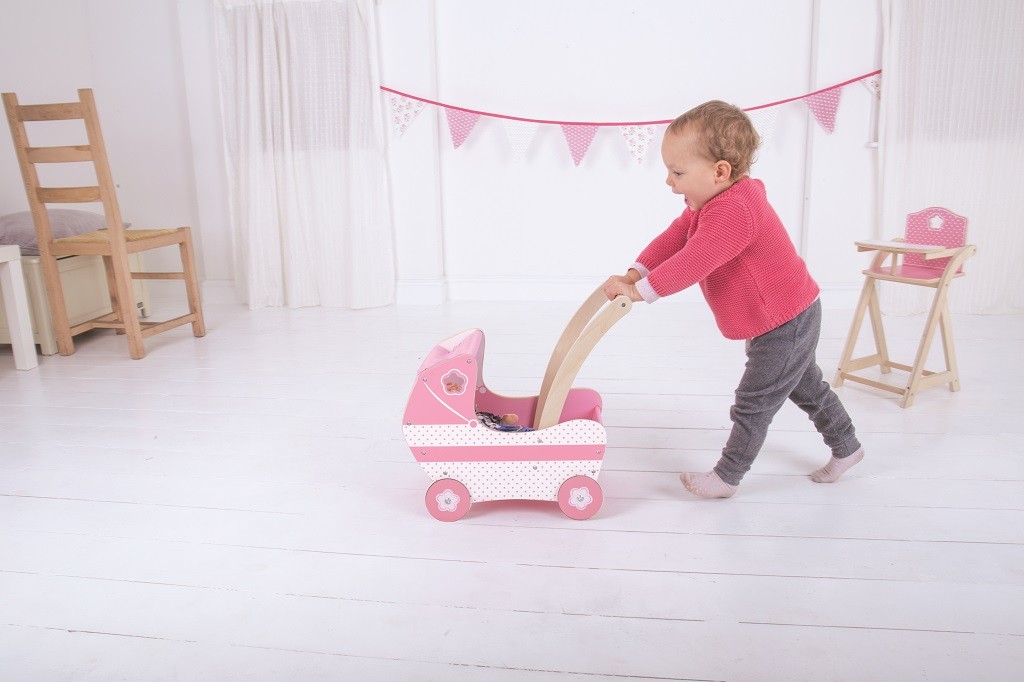 Dřevěný kočárek pro panenky v krásné růžové barvě s látkovou stříškou a precizně vyřezávanými detaily. Kočárek obsahuje jednoduchou vystélku, aby panenky cestovaly pohodlně. Pevná kola jsou opatřena gumovým proužkem pro tichý chod i na tvrdých podlahách. Pohodlně uchopitelné madlo a stabilní konstrukce zaručují zábavu při hře. Pomáhá inspirovat kreativní hraní rolí a rozvíjí sociální dovednosti. Vyžaduje montáž. Vyrobeno z vysoce kvalitních, zodpovědně získaných materiálů. Splňuje aktuální evropské bezpečnostní normy. Lze jej využít i jako dekoraci.  Hlavní vlastnosti: rozvíjí kreativitu a sociální dovednostipohodlně uchopitelné madlo a stabilní konstrukceobsahuje jednoduchou vnitřní vystélkupogumovaná pevná kola