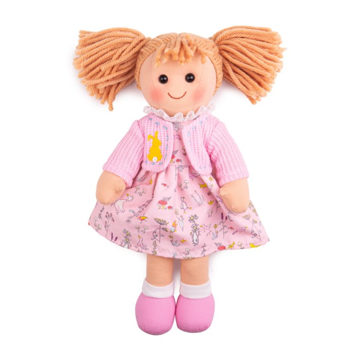 Seznamte se s panenkou Ellou, světlovlasou culíkatou panenkou, která má na sobě jarní růžové šatičky, měkký pletený svetřík s motivem králíka a k tomu ladící růžové boty. Tato měkká a mazlivá panenka hledá kamaráda, který by si s ní hrál. Oblečení Bigjigs Toys je možné svlékat a oblékat panence podle potřeby. Hračka vyhovuje současným evropským bezpečnostním normám. Hlavní vlastnosti: bezpečné měkké tělíčkohra s panenkou rozvíjí jemnou motoriku a schopnost pomáhat, pečovatk panence Bigjigs Toys lze dokupovat oblečení v příslušné velikostivhodné již od narozeníodpovídá současným evropským bezpečnostním normám