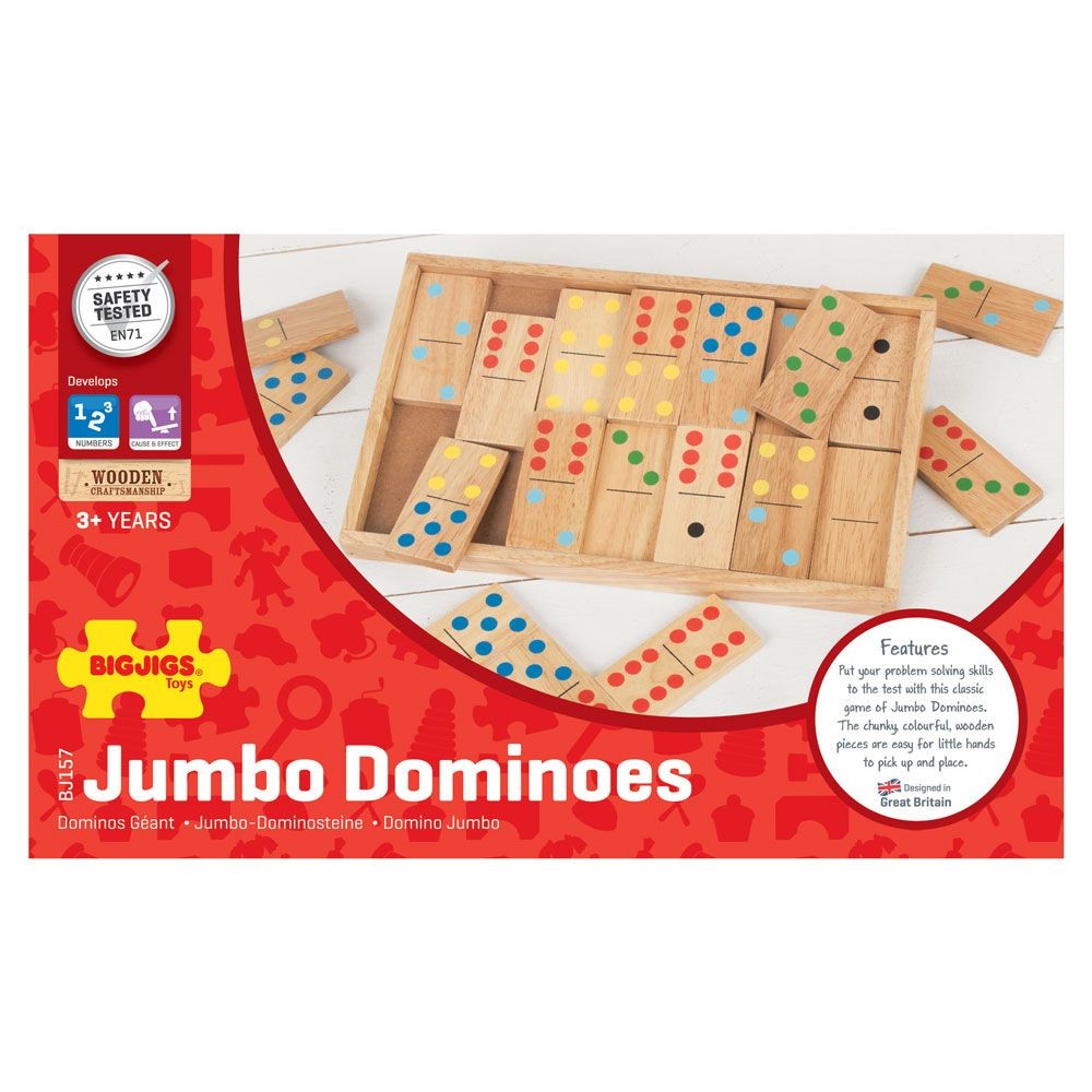 Tohle pestrobarevné dřevěné domino Jumbo, je perfektně dimenzováno pro malé ručičky, kterým se tak dílky snadno zvedají a umisťují. Hra pomáhá rozvíjet obratnost, dovednosti v souhře a koncentraci. Hrací dílky lze po ukončení hry uložit do dřevěné krabice s posuvným víkem.  Hlavní vlastnosti: vyrobeno z vysoce kvalitních materiálůvyhovuje současným evropským bezpečnostním normámobsahuje 28 hracích dílků