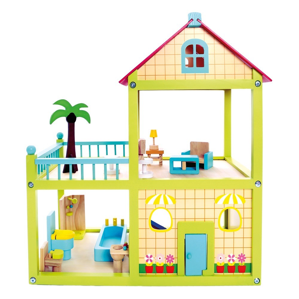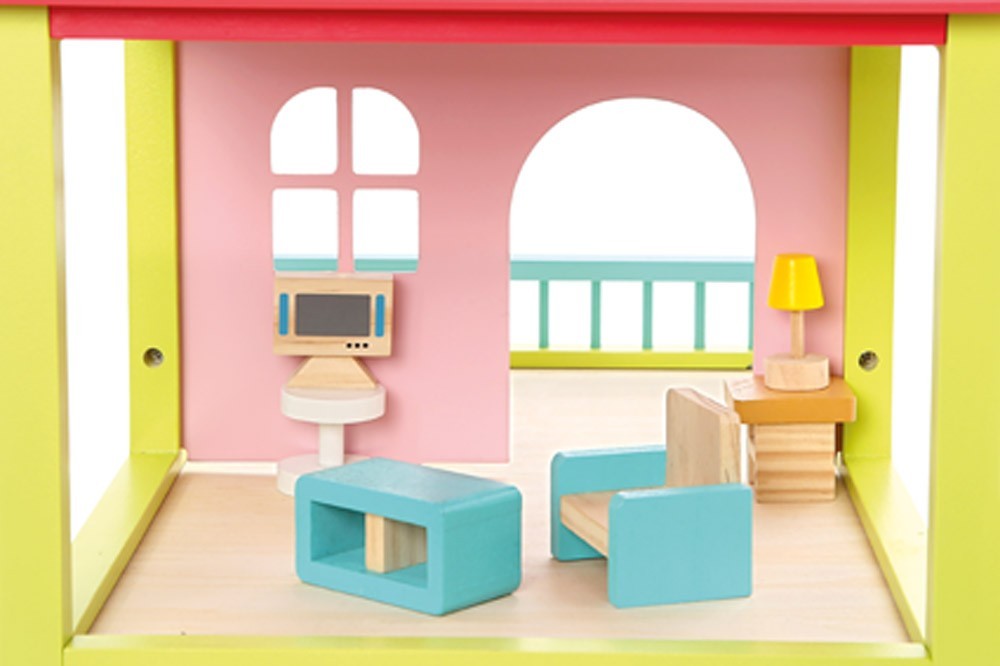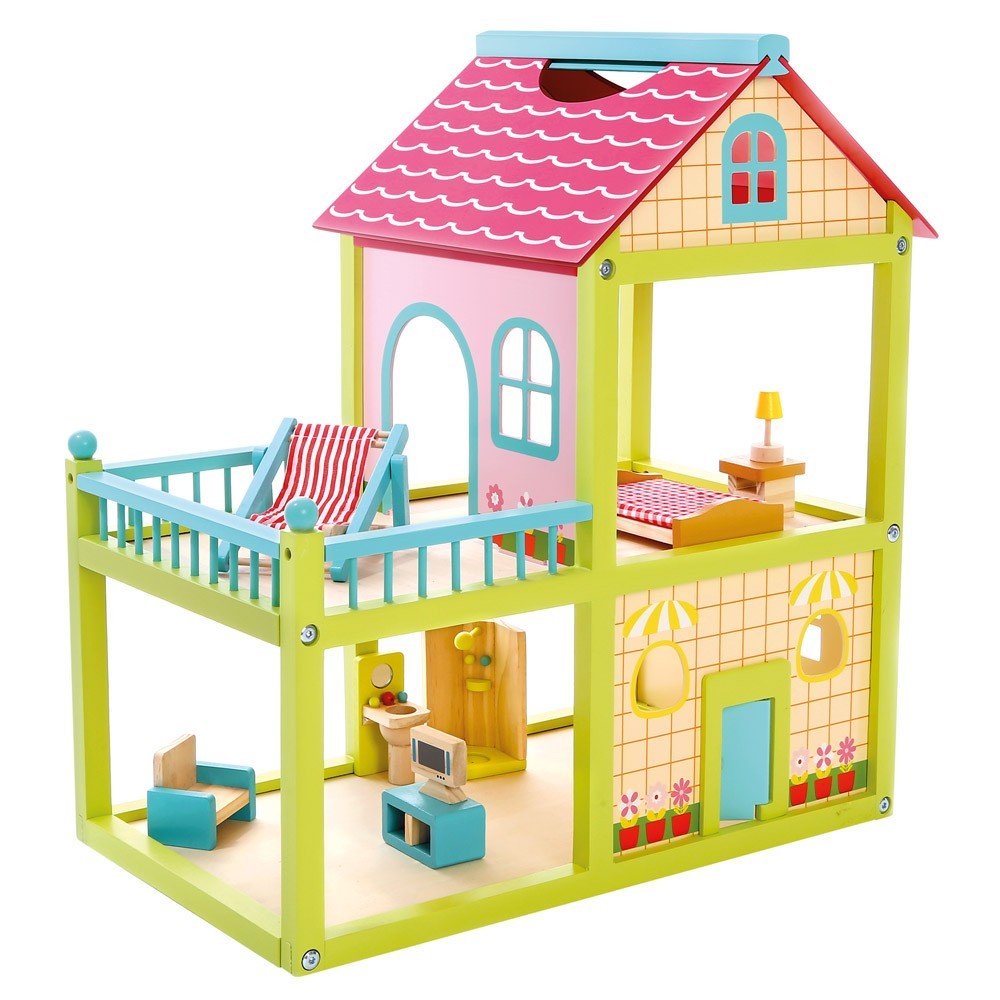 Velký dřevěný domeček pro panenky v pestrých barvách je krásná hračka, která vzbudí zvědavost každého dítěte a udrží jeho pozornost po dlouhou dobu! Domeček pro panenky má terasu a je vybaven nábytkem.   Hlavní vlastnosti: Podporuje herní nápadydomeček je celý otevřený pro lepší hranírozměry: 50 cm délka x šířka 32 x výška 55,5 cm