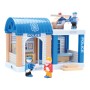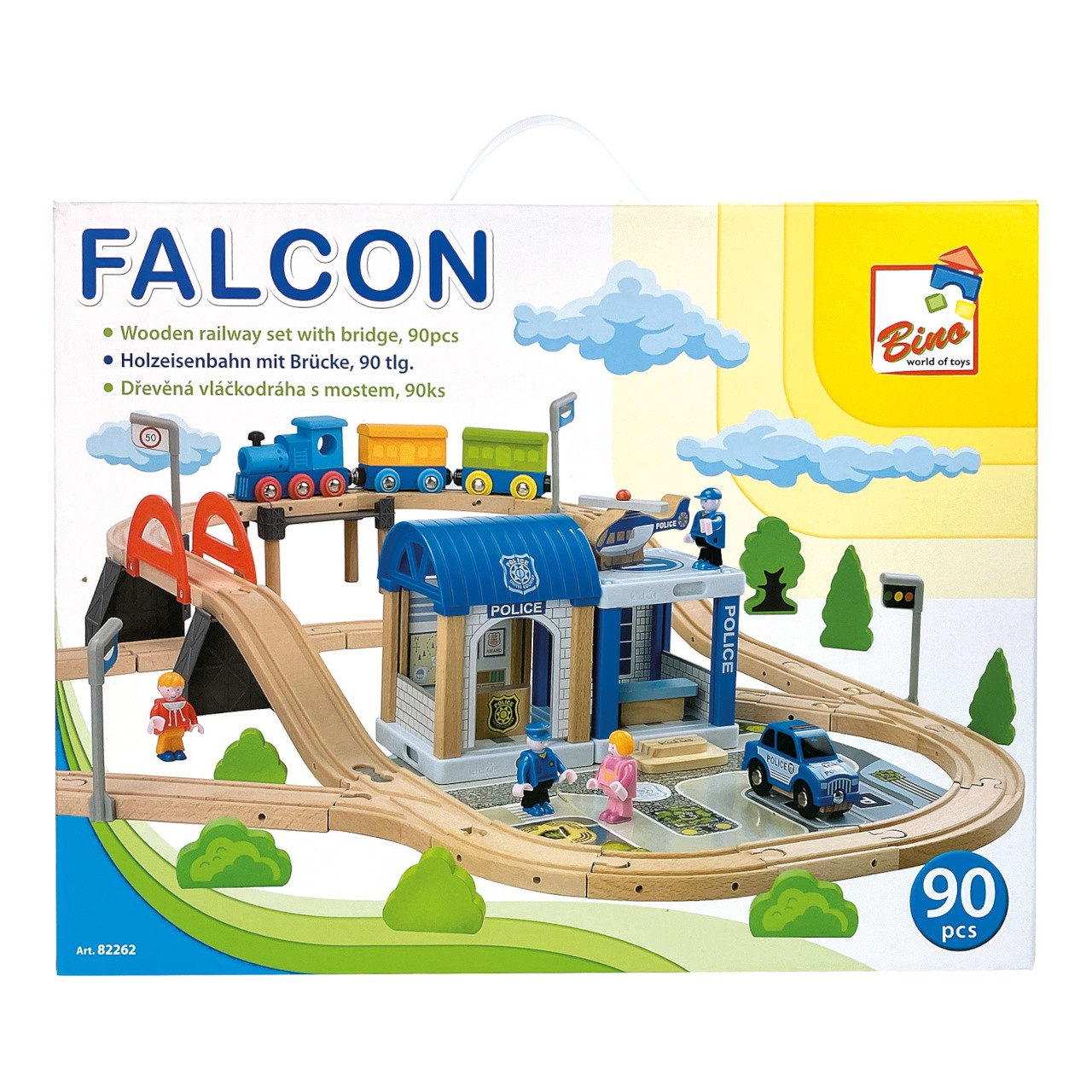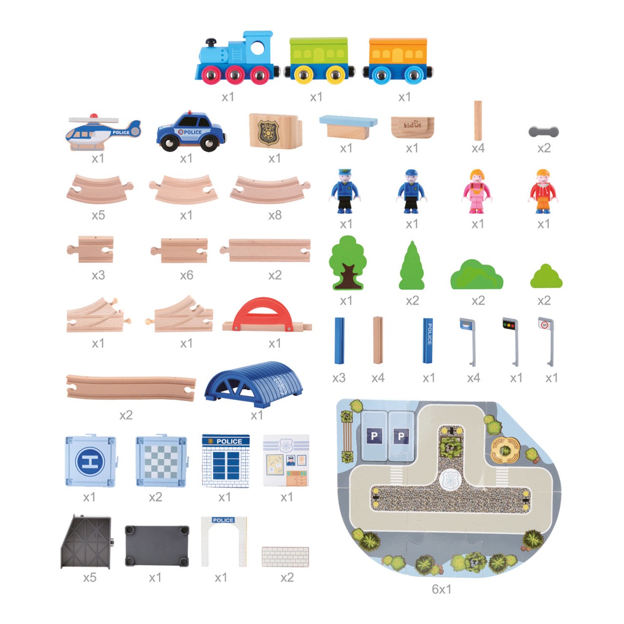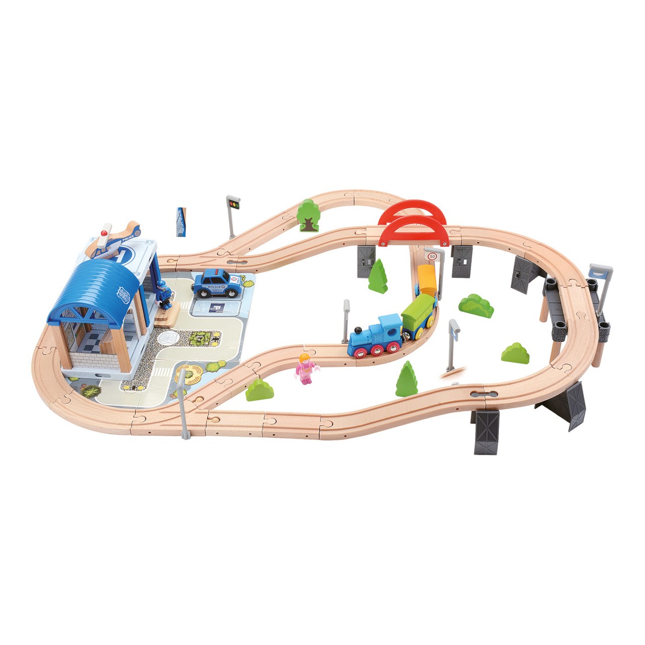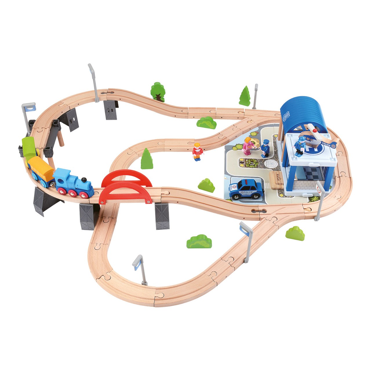 Vydejte se plnou parou malebnou krajinou, ale nepřekročte povolenou rychlost! Vláčkodráha nabízí vyvýšenou trať s můstkem a propracovanou policejní stanicí, jejíž součástí je i autíčko a helikoptéra. Souprava obsahuje také několik různých pohyblivých figurek, s nimiž je hra ještě poutavější! Okolí trati můžete dokreslit drobnými doplňky, které pomáhají dále rozvíjet dětskou fantazii. Vyrobeno z odolného masivního dřeva a nezávadného plastu. Díly dráhy jsou variabilní a kompatibilní s vláčkodráhami všech velkých výrobců.   Hlavní vlastnosti:90 dílů celkem; dráha s policejní stanicí a doplňky, lokomotiva se 2 vagónky, autíčko, helikoptéra a 4 figurkyrobustní, odolné a atraktivní zpracováníkompatibilní s vláčkodráhami dalších výrobců