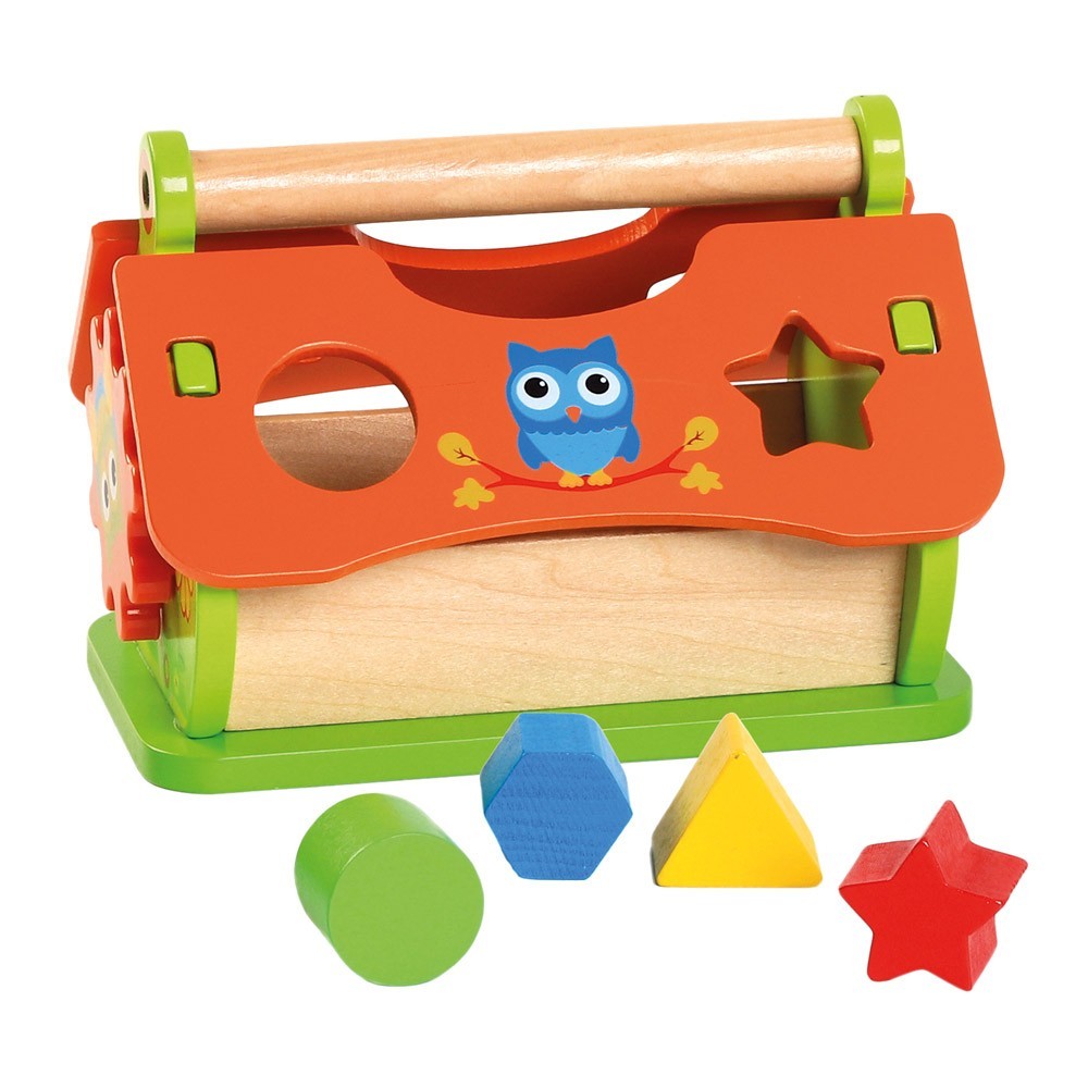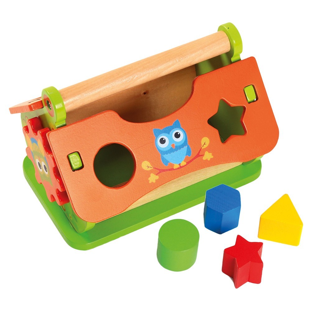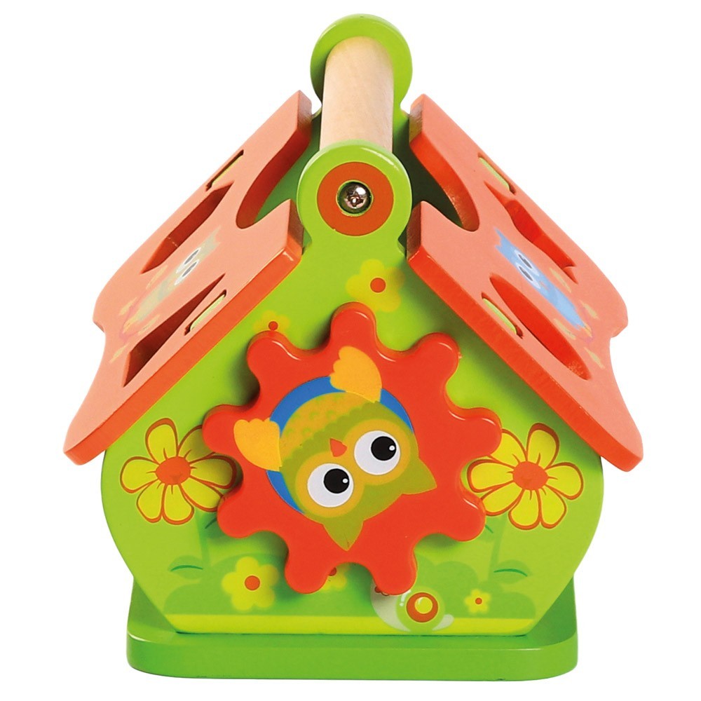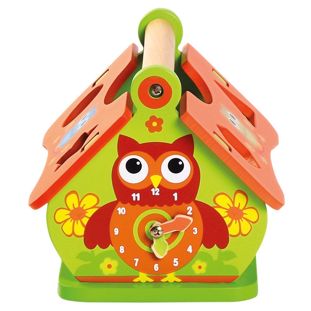 Pestrobarevný domeček s odklápěcí střechou nabízí dodatečné aktivity na průčelích. Nechte dítě rozvíjet jemnou motoriku vkládáním různobarevných kostiček a otáčením ozubeného kolečka. Otáčet lze také ručičkami hodin s motivem sovy, při kterém můžete dítko uvést do orientace v čase. Domeček je univerzální hračkou, najde uplatnění při mnoha dalších hrách. Je robustní, vyroben ze silné překližky a masivního dřeva, vybaven madlem, díky kterému se bude dítěti snadno přenášet. Hlavní vlastnosti: domeček s 2 dílnou střechou a 4 díly ke vkládánírozvíjí jemnou motoriku, rozpoznávání barev a tvarůpomůže uvést do orientace v časerobustní dřevěné provedenímadlo k přenášení