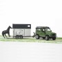 Bruder LAND ROVER + přepravník na koně  Bruder LAND ROVER DEFENDER zelený s přívěsem a koněm je térénní dvounápravový vůz propracovaný do detailů. Má otevíratelný motorový prostor s detailním zpracováním pohonného agregátu, otevírání dveří, odpružené obě nápravy, otevírání zadních dveří nákladového prostoru, odnímatelné závěsné zařízení, střešní zahrádku, funkční řízení. Vůz lze ovládat buď klasickým volantem na místě řidiče, nebo je možné použít prodloužený volant a zasunout jej do adaptéru ve středovém panelu LAND ROVERU po otevření střešního okna, což usnadní ovládání vozu. Prodloužený volant je součástí vozu a je umístěn v podvozku. Přívěs má zadní nájezd a otvíratelné zadní i boční dveře. Vyrobeno v Německu, z kvalitních materiálů.Hlavní vlastnosti: térénní dvounápravový vůzotevíratelný motorový prostorotevírácí dveříodpružené nápravyotevírátelné zadní dveře nákladového prostoruodnímatelné závěsné zařízenístřešní zahrádkaotevření střešního oknapřívěs se zadním nájezdem a otvíratelnými zadními i bočními dveřmivyrobeno v Německu