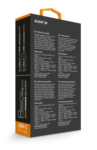 Chytrá síťová nabíječka ALIGATOR GaN, Power Delivery 65W, 2xUSB-C, 1xUSB-A, černá