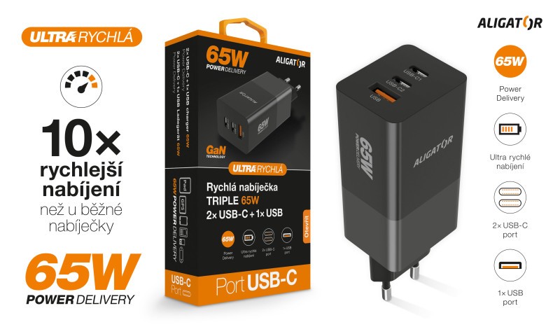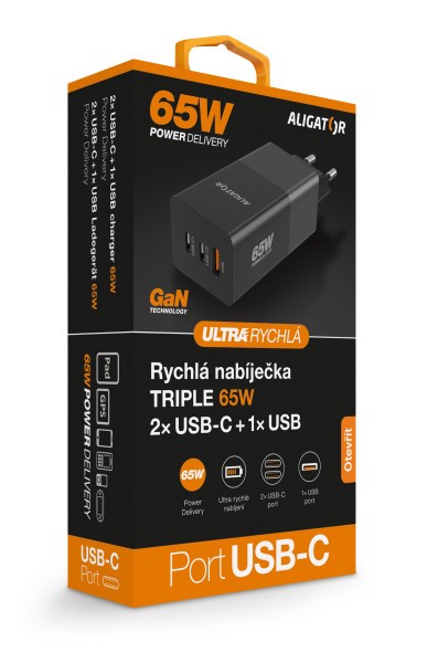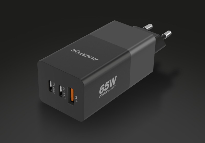 Rychlá GaN síťová nabíječka 2xUSB-C + USB ALIGATOR Power Delivery 65W