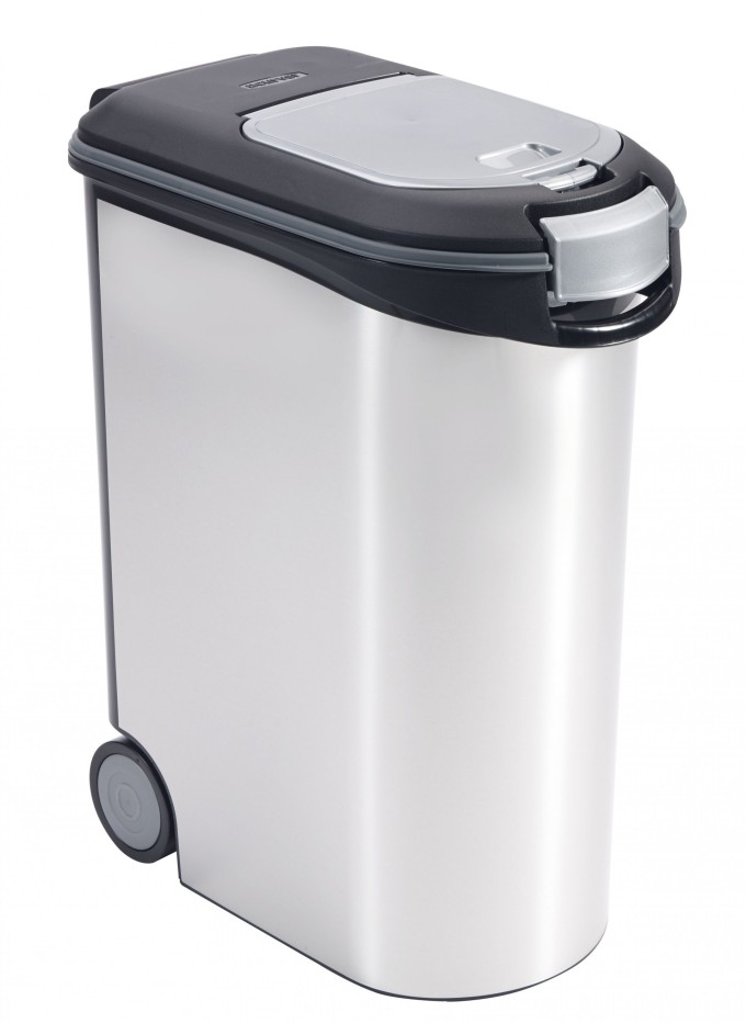 Kolečka na zadní straně zajišťují snadnější přepravu kontejneru. Kontejner je opatřen těsněním, které zabraňuje cirkulaci vzduchu a úniku pachu a tím udržuje krmivo čerstvé se zachováním všech vitamínů. Kontejner má praktický otvor, kde je zároveň umístěna lopatka pro snadnější nabírání granulí.