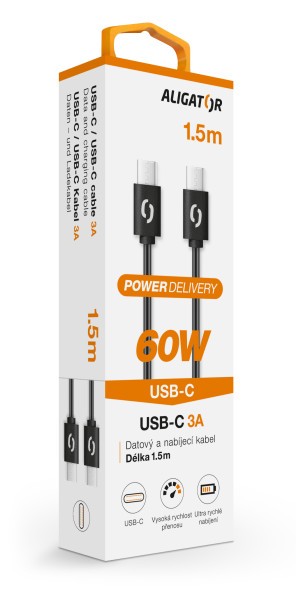 Datový kabel ALIGATOR POWER 65W, USB-C/USB-C 3A 1,5m, černý
