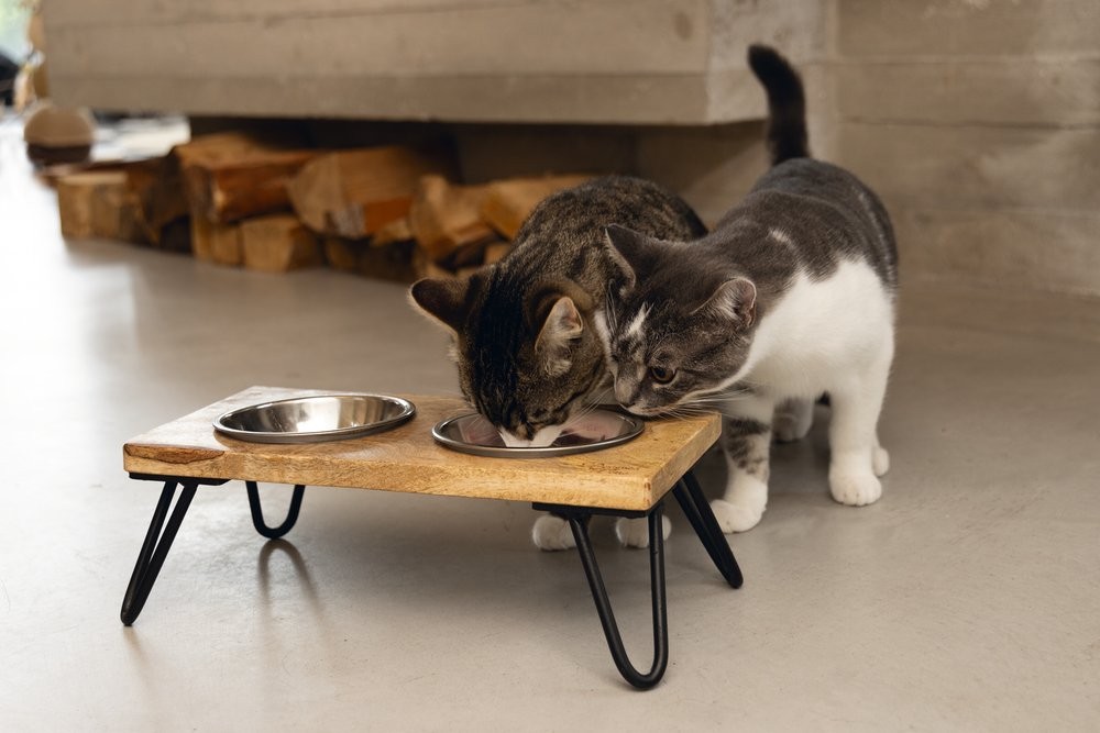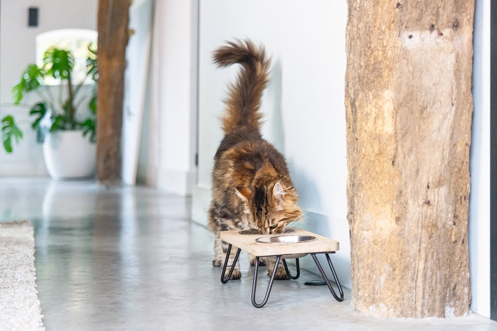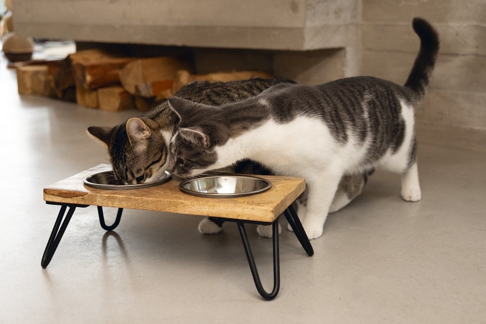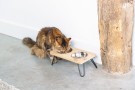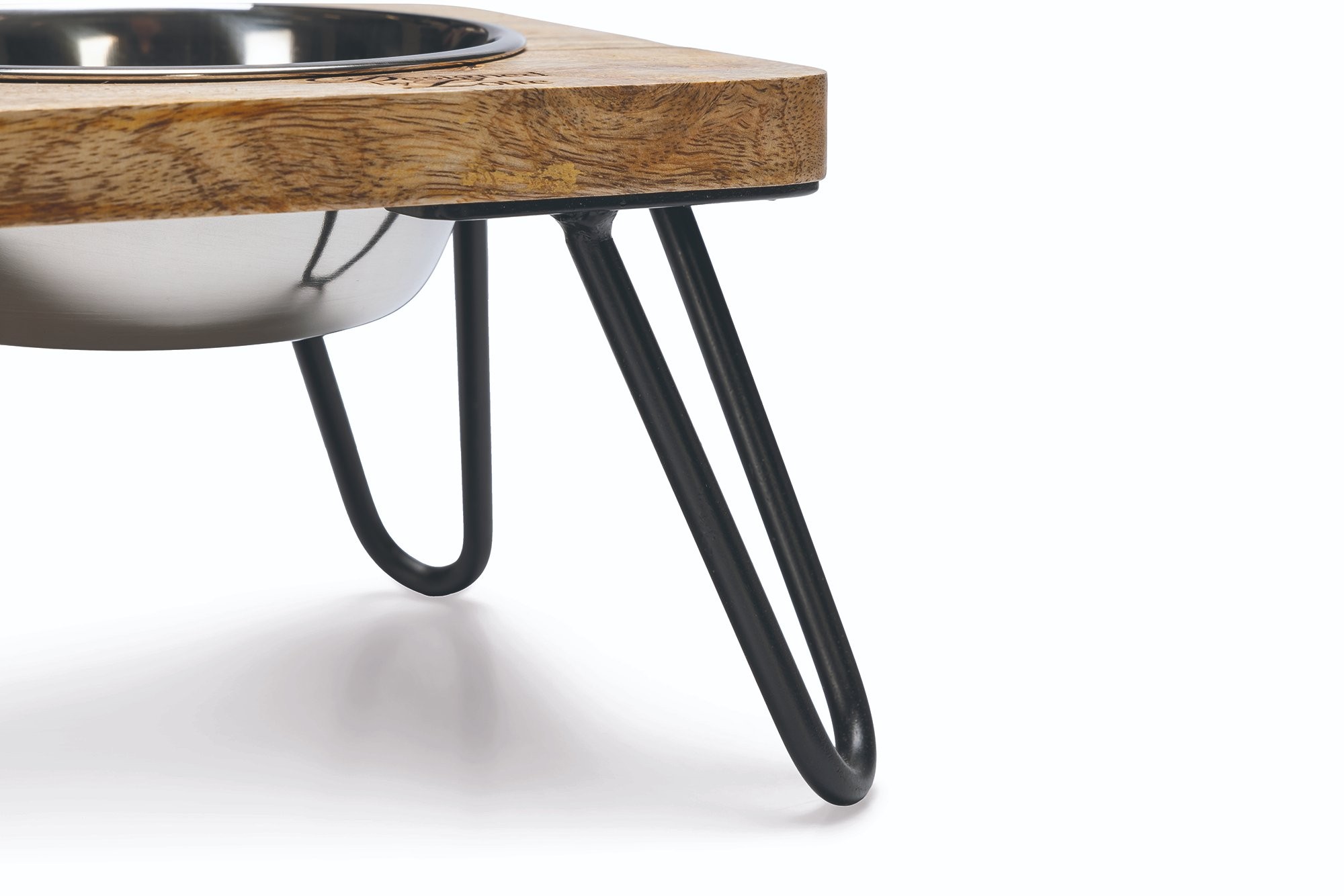 Elegantní stojan z mangového dřeva v kombinaci s kovem, 2 nerezové misky. Vhodné pro kočky a malé psy. Celý popis