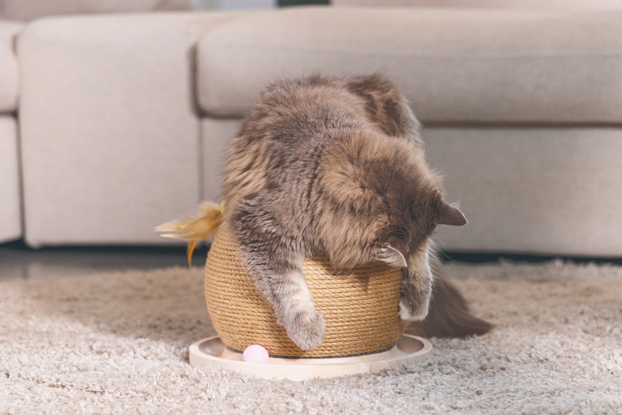 Řekněte - co může být pro Vaši kočku zábavnější než hraní a škrábání zároveň? Obojí je možné s hračkou Mila od Designed by Lotte. Nabízí kulatou základnu z kaučukového dřeva se štěrbinou a míčky. Jakmile se Vaše kočka dotkne míčků čumáčkem nebo tlapkou, začnou se ve štěrbině kutálet. Je Váš chlupatý mazlíček dostatečně rychlý, aby všechny následoval? Do této herní základny je zasazena škrabací koule, omotaná jutovým provazem. Zde si Vaše kočka může brousit drápky dle libosti a pečovat o ně. Třešničkou na dortu jsou pírka na lanku, takže extra zábava může začít!
