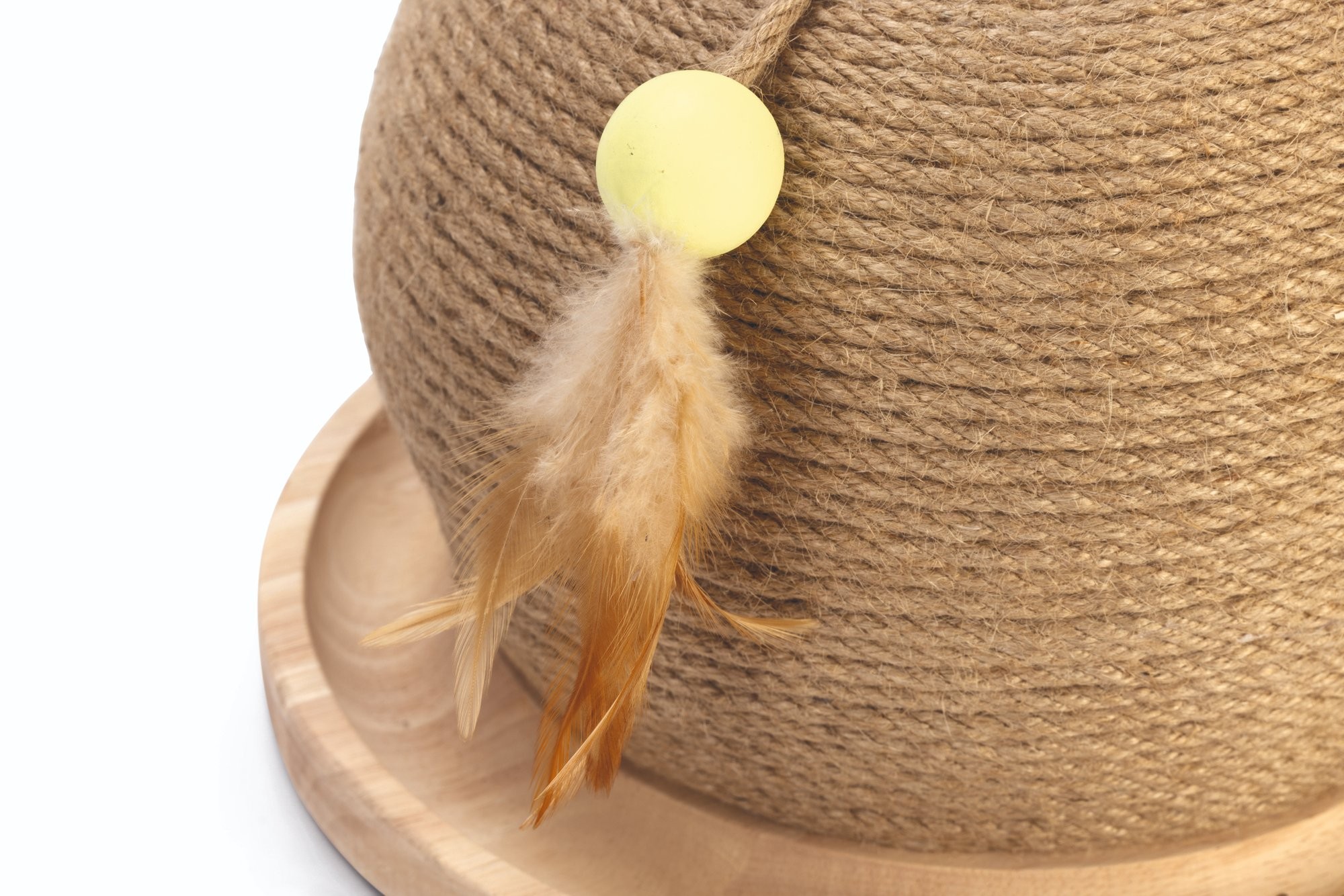 Škrabadlo ve tvaru koule s hračkou, kombinace kaučukového dřeva a juty. Celý popis