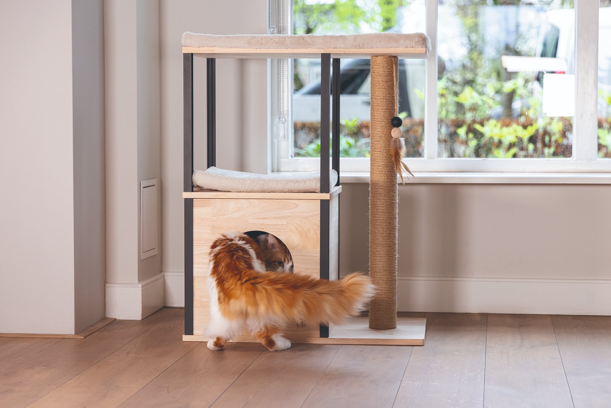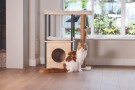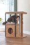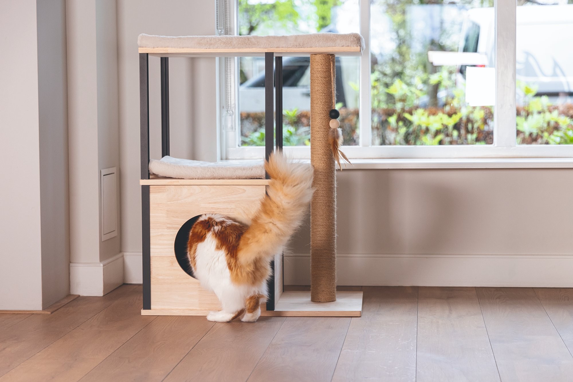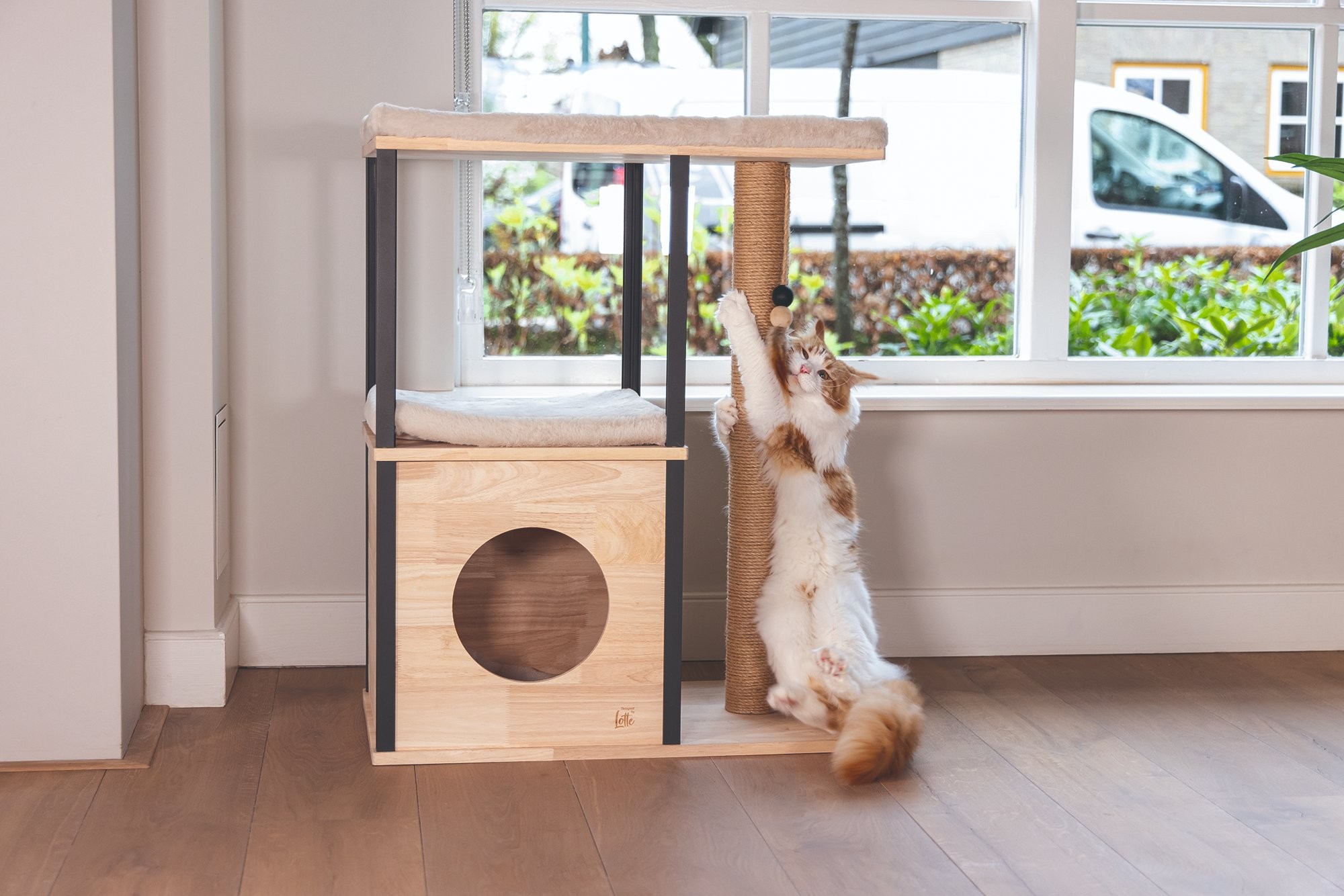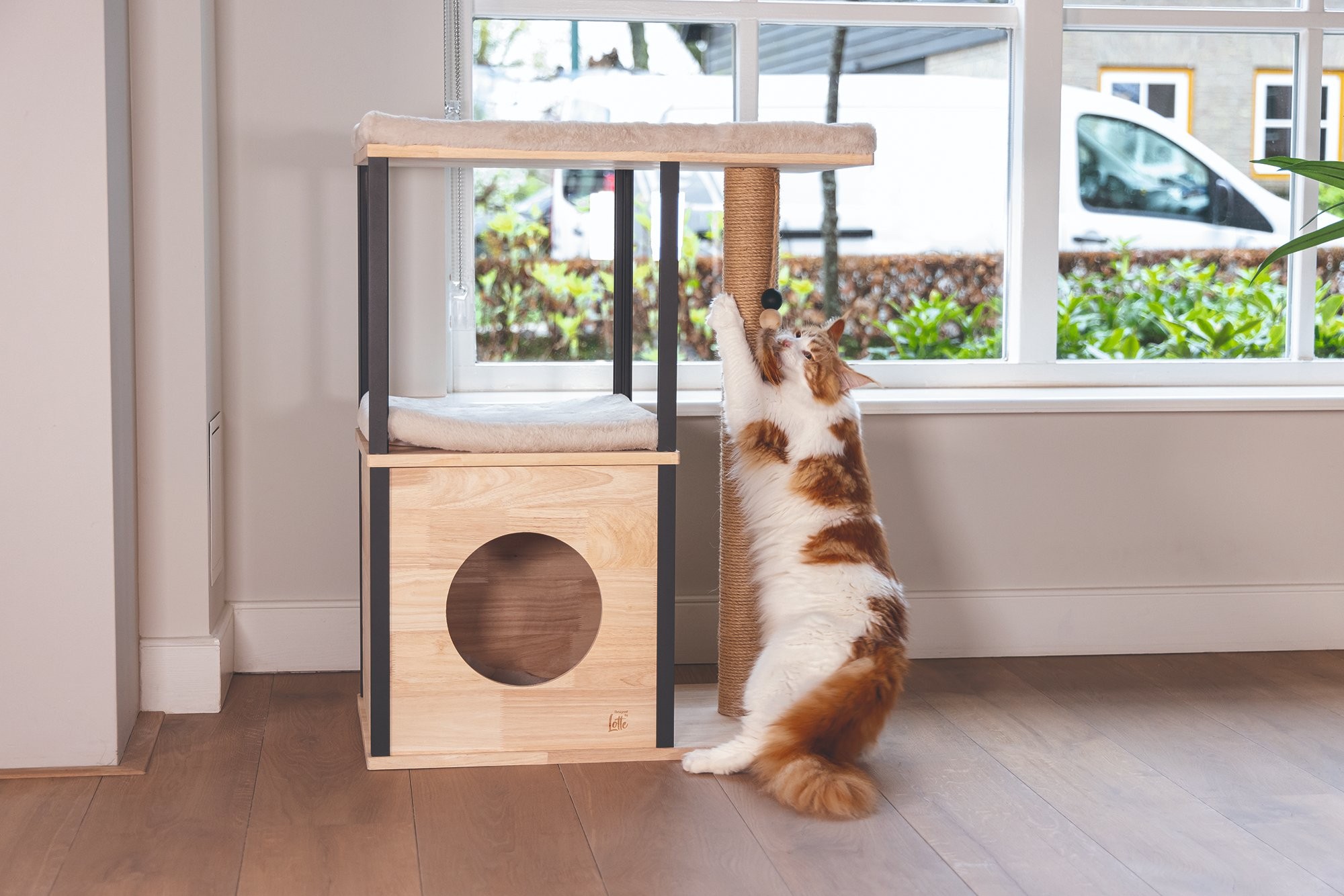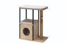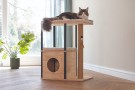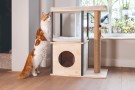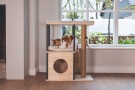 Dřevěný škrabací nábytek pro kočky s odpočívadlem, kukaní a hračkou. Celý popis