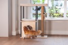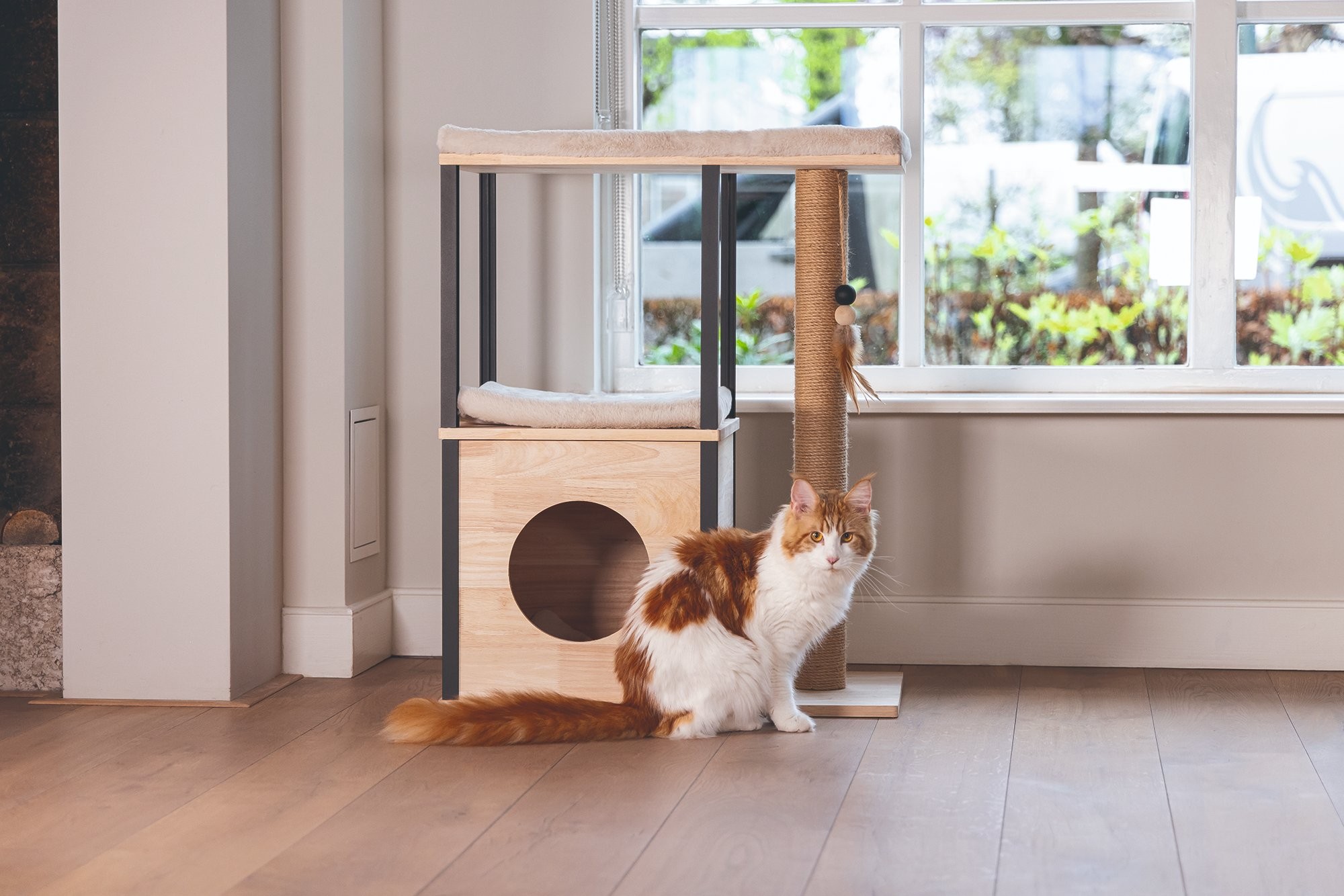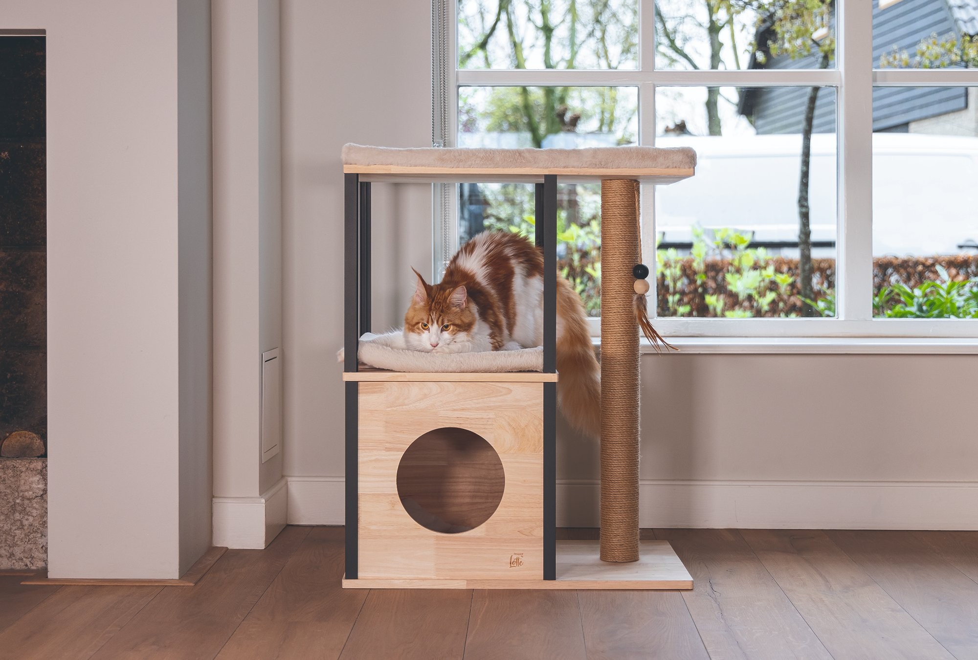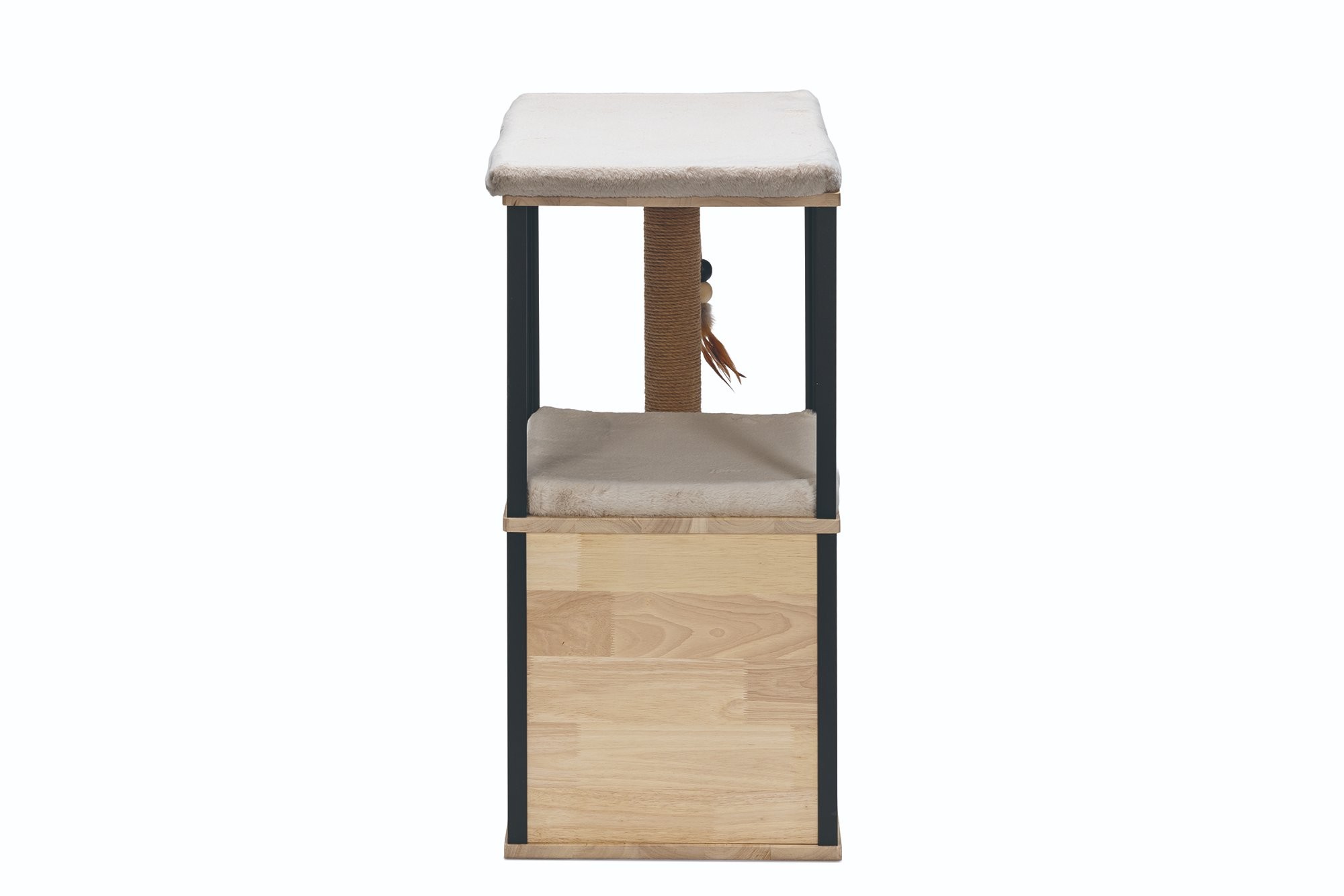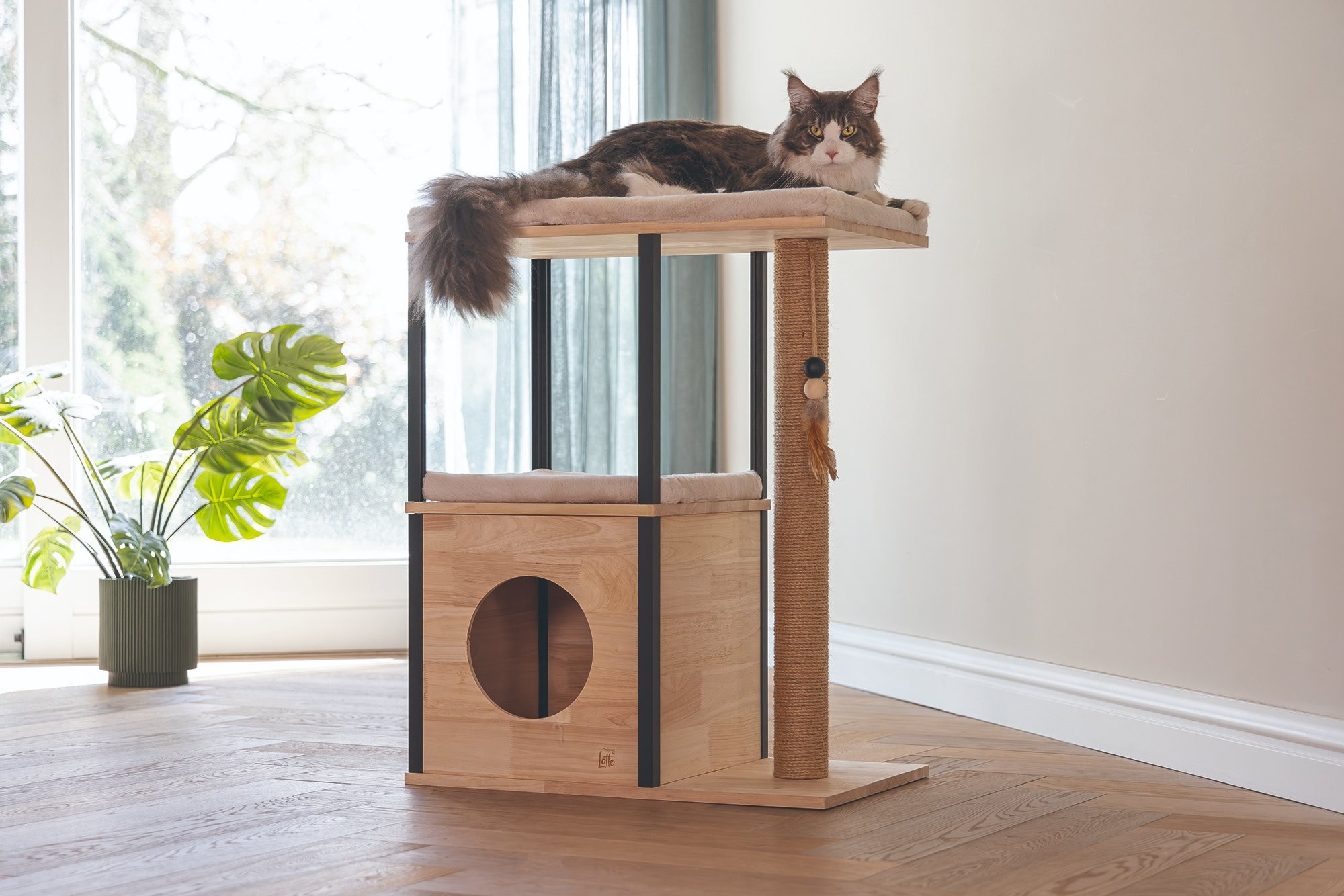 Dřevěný škrabací nábytek pro kočky s odpočívadlem, kukaní a hračkou. Celý popis