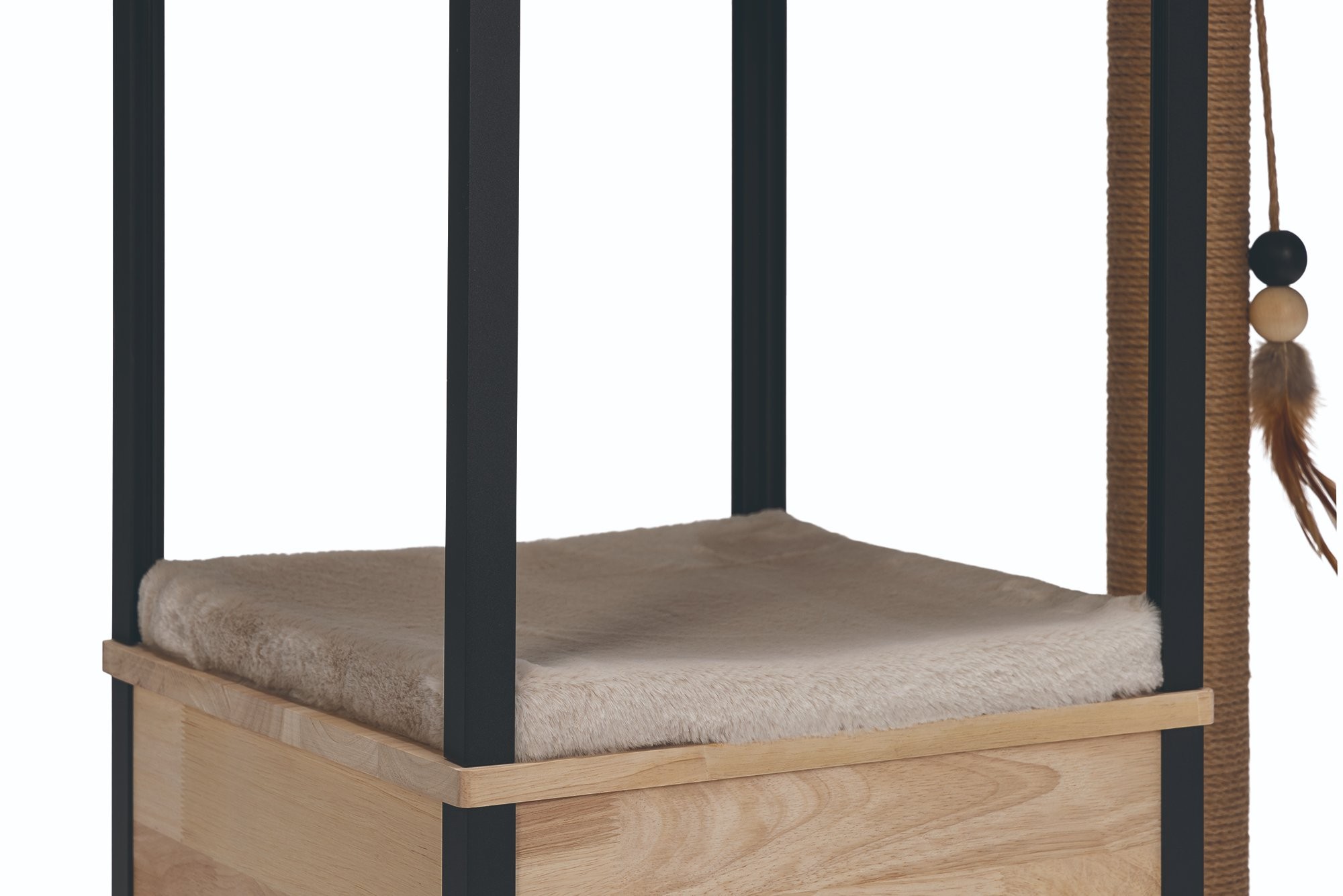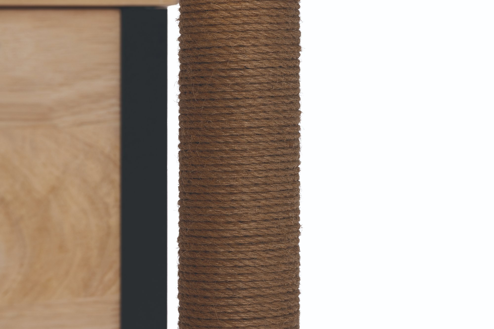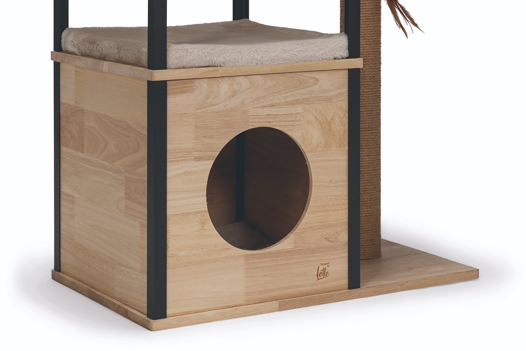 Představujeme Vám praktický a krásný kus nábytku jménem Nala od Designed by Lotte. Bude nejen skvělým škrabadlem pro Vaši kočku, ale poskytne jí hned několik pohodlných míst k odpočinku. Domeček má vepředu jeden vstupní otvor, a tak zajistí, že se Váš mazlíček bude uvnitř cítit v bezpečí. Přidané polštářky v domečku a na plošinách přispívají při lenošení k extra pohodlí. Škrabadlo je vyrobeno z kaučukového dřeva a má krásný hliníkový rám. Škrabací sloupek je obalen jutou. Pro ochranu Vaší podlahy je toto škrabadlo dodáváno s ochrannými nožičkami.