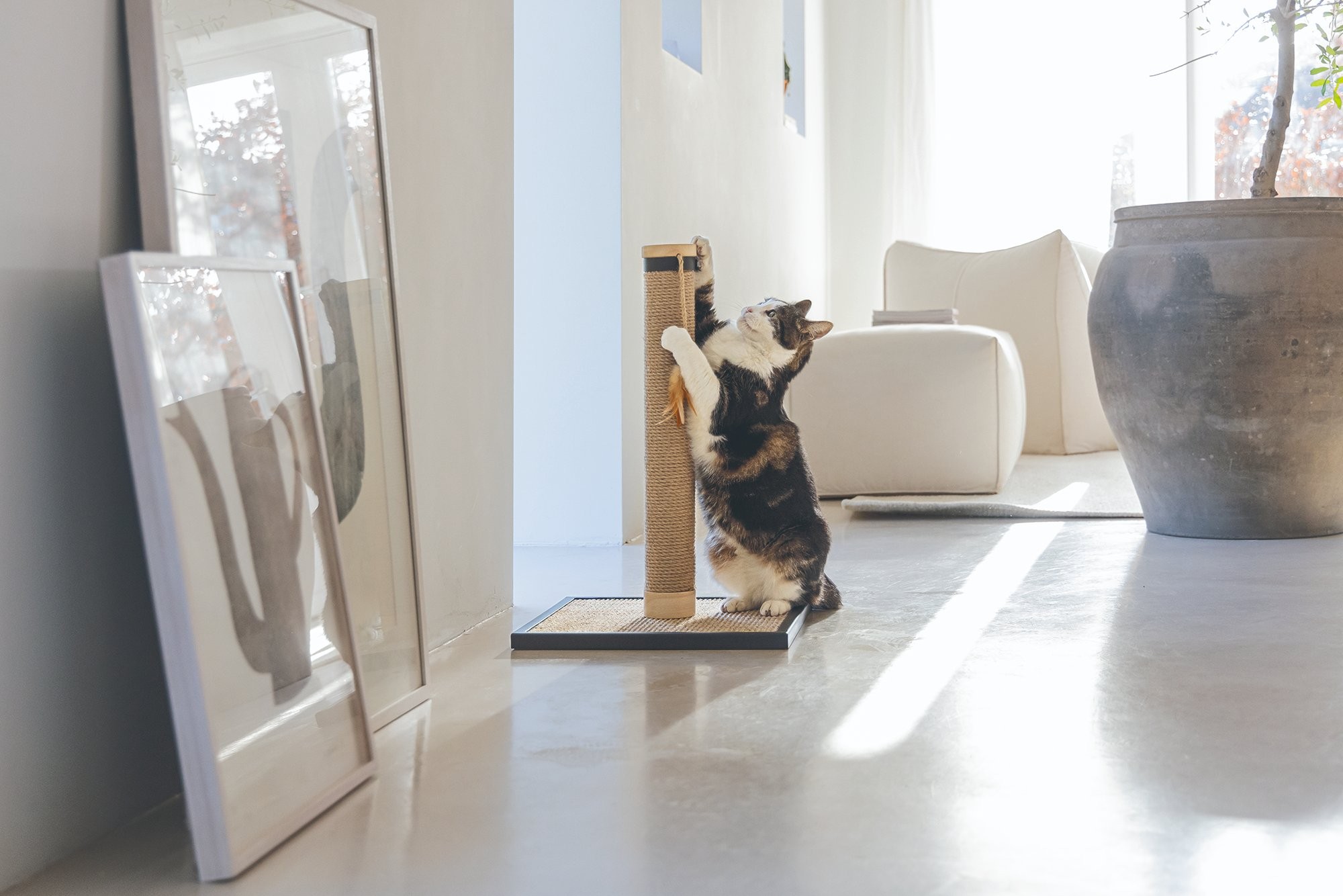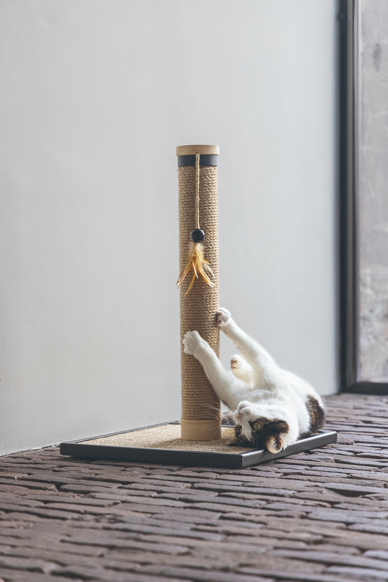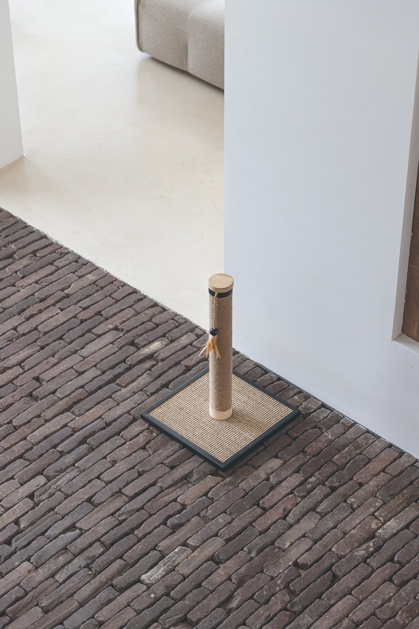 Škrabadlo Vyda od Designed by Lotte je nejen skvělým škrabadlem pro Vaši kočku, ale také krásným doplňkem interiérů v různých stylech. Spodní deska je zakončena kovovým rámem a potažena sisalovou škrabací rohožkou. Škrabací plochu sloupku tvoří jutové lano. Škrabadlo tak Vašemu mazlíčkovi nabízí 2 různé povrchy a navíc možnost škrábat horizontálně i vertikálně. Brzy si všimnete, že Vaše kočka prostě miluje zarývat své drápky do tohoto škrabadla. Hračka s peřím dělá škrabadlo i perfektním místem na hraní. Pro ochranu podlahy před poškrábáním jsou součástí dodávky protiskluzové krytky.