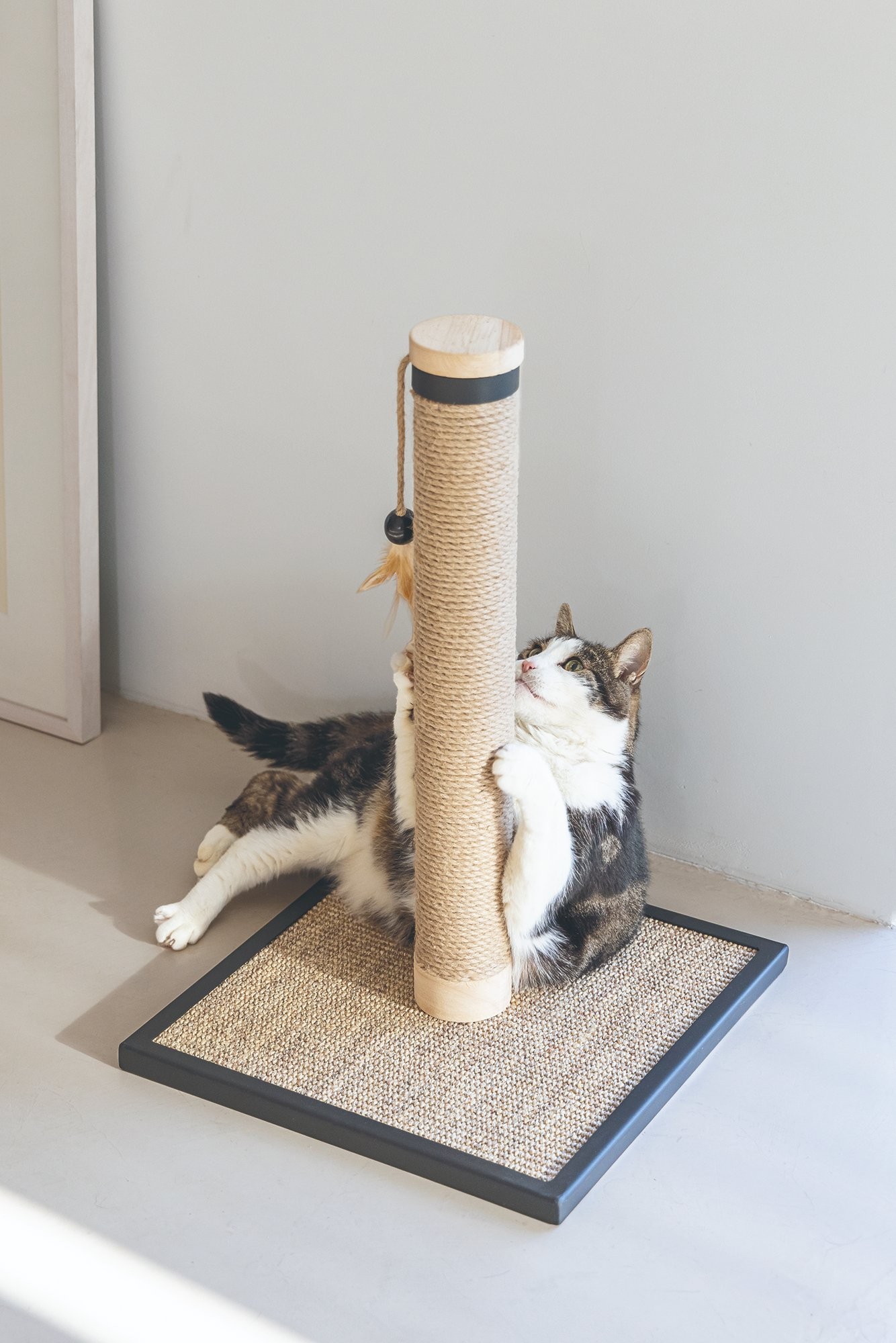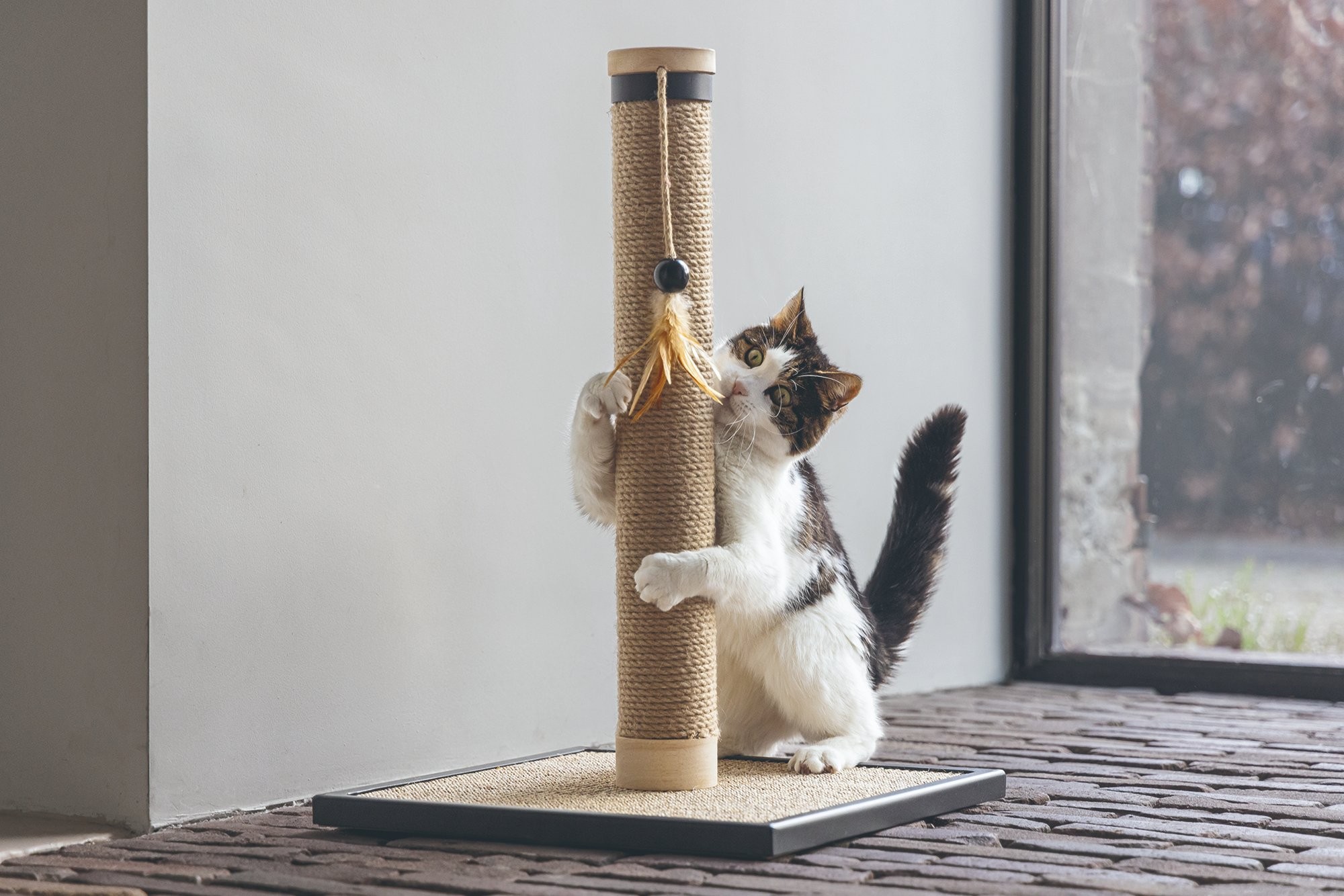 Robustní škrabadlo s hračkou. Kombinace MDF, kovu, juty a sisalu. Vhodné pro kočky až do 7 kg. Celý popis