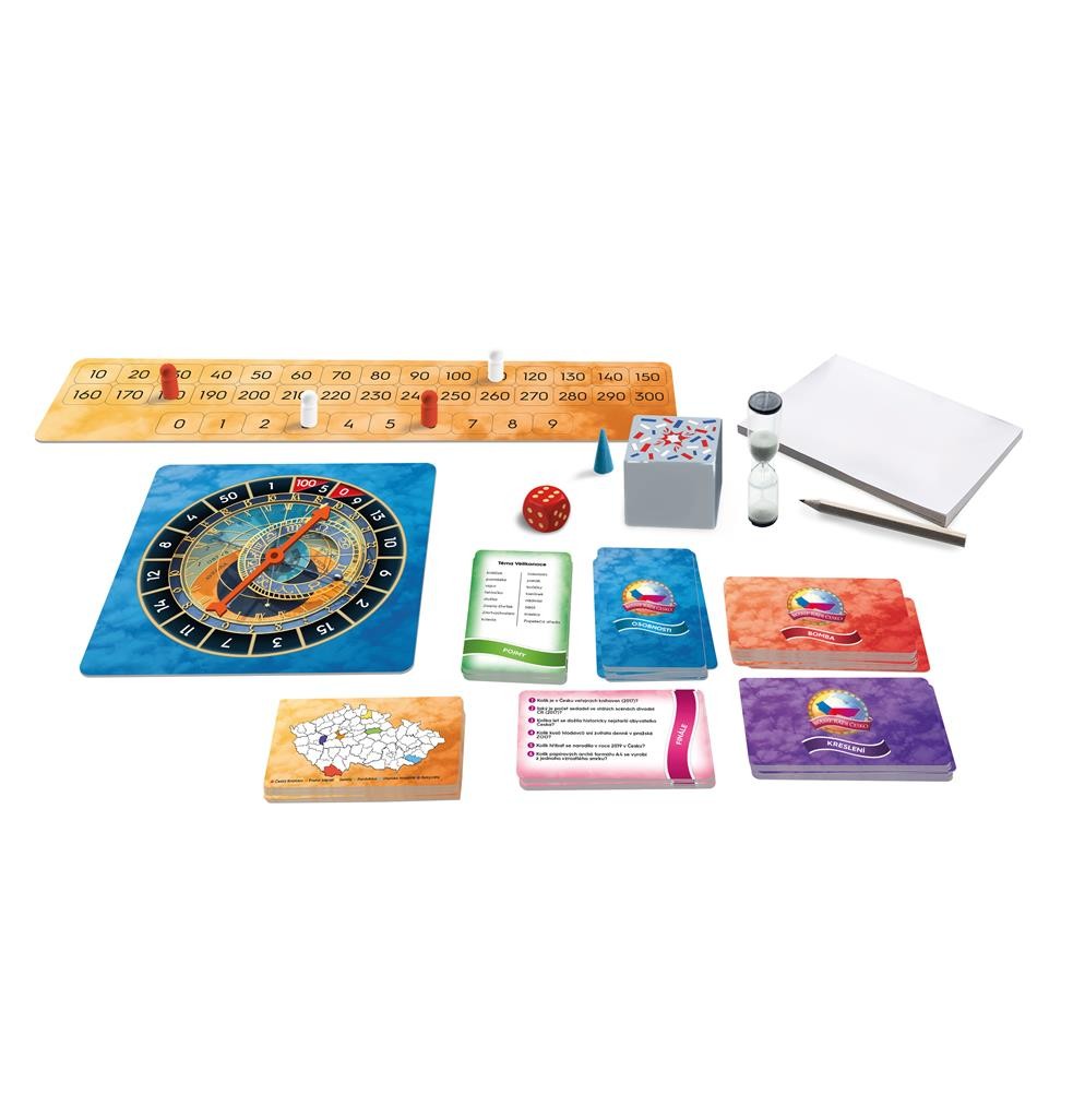 Užijte si stejnou dávku napětí, jakou znají soutěžící z televizního pořadu Máme rádi Česko. Vědomostní hra na motivy populární TV soutěže proti sobě staví dva týmy, které poměřují své znalosti o naší vlasti. Cíl je jasný – získat co nejvíce bodů ve všech disciplínách. Otestujete nejen své vědomosti, ale i kreativitu a pohotovost. Které disciplíny vás čekají? Budete hádat jména slavných českých osobností, hádat správné pojmy podle popisu kapitána týmu a podobně to bude i u kreslení, kdy musíte poznat, co chce spoluhráč svým výtvarným uměním říci. Pro milovníky zeměpisu bude lahůdkou slepá mapa, fandové adrenalinu se pobaví u bomby. Stihnete odpovědět správně dřív, než vybuchne? Na závěr ještě pořadím mohou zamíchat finálové karty. Balení obsahuje: 148 karet5 figurek1 přesýpací hodiny (1,5 minuty)1 hrací kostka1 bloček, 1 tužka1 bodovací tabulka1 tikající bomba1 kolo štěstí Hlavní vlastnosti: vědomostní hra na motivy populární TV soutěže hra testuje vědomosti, ale i kreativitu a pohotovost pro milovníky zeměpisu bude lahůdkou slepá mapa fandové adrenalinu se pobaví u bomby Dokumentace:návod ke hře Máme rádi Česko (CZ)
