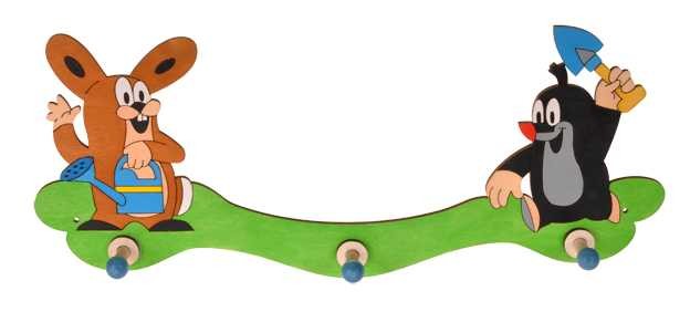 Veselý věšáček Krtek a zajíc na zahradě, je krásná dekorace a zároveň i skvělá pomůcka jak naučit děti udržovat pořádek. K upevnění slouží předvrtané otvory pro šrouby, dodáváno bez spojovacího materiálu. Hlavní vlastnosti: originální tvar s třemi háčky pro zavěšeníveselý motiv a barvičky do dětského pokojíčku© Zdeněk Miler