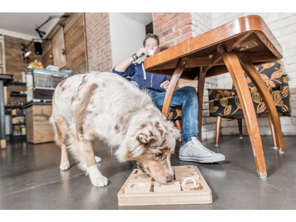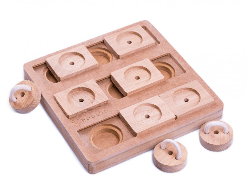 Pamlskový hlavolam pro psy všech plemen. Přírodní dub/MDF, 9 polí na odměny, level 3. Celý popis