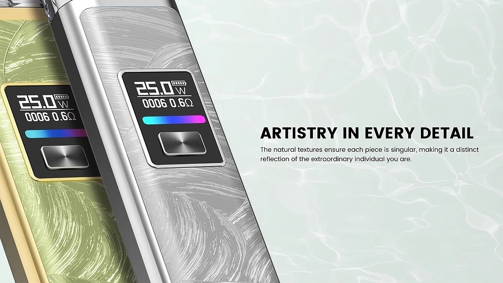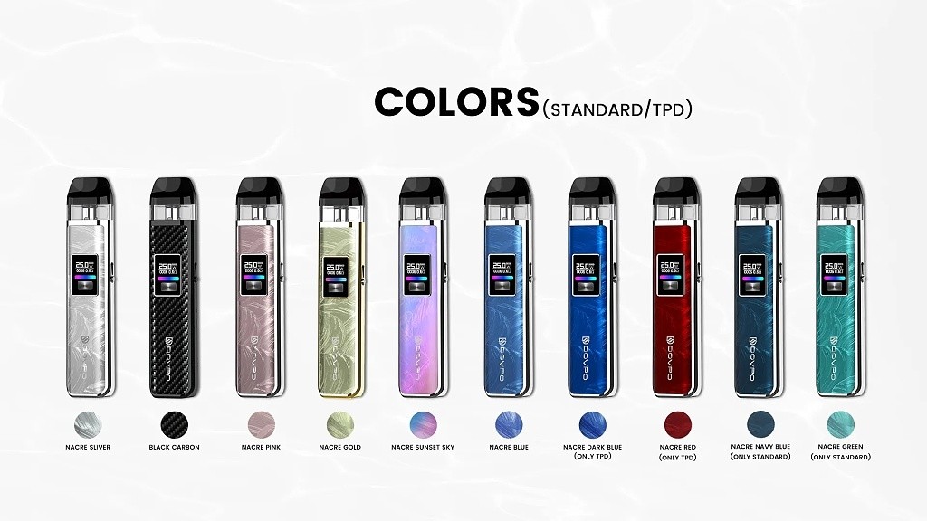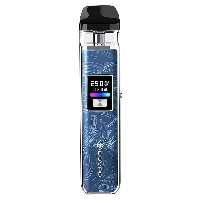 Elektronická cigareta typu POD, určená pro MTL i RDL styl vapování. Rozměry: 115,1mm x 25mm x 14,5mm, hmotnost: 63g, rozsah výstupního výkonu: 5W – 30W (nastavitelný), Objem cartridge: 2ml, baterie: 1000mAh (integrovaná), automatické i manuální spínání potahu, OLED displej, regulace přívodu vzduchu (Airflow), nabíjení: USB-C 5V/1A, materiál: Plast (PC), PCTG, zinková slitina, výrobce: Dovpo, barva: Nacre Blue (modrá).