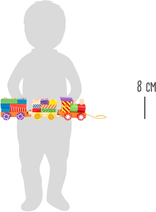 Vlak s mnoha skvělými barvami a vzory. Může změnit svůj vzhled pomocí barevných dřevěných bloků, které lze je jednoduše přemístit podle Vašich priorit Lokomotivu a dva vagóny lze vzájemně spojit a následně táhnout šňůrou. Hlavní vlastnosti: podporuje rovnováhu a koordinaci pohybůveselé barevné provedení i design