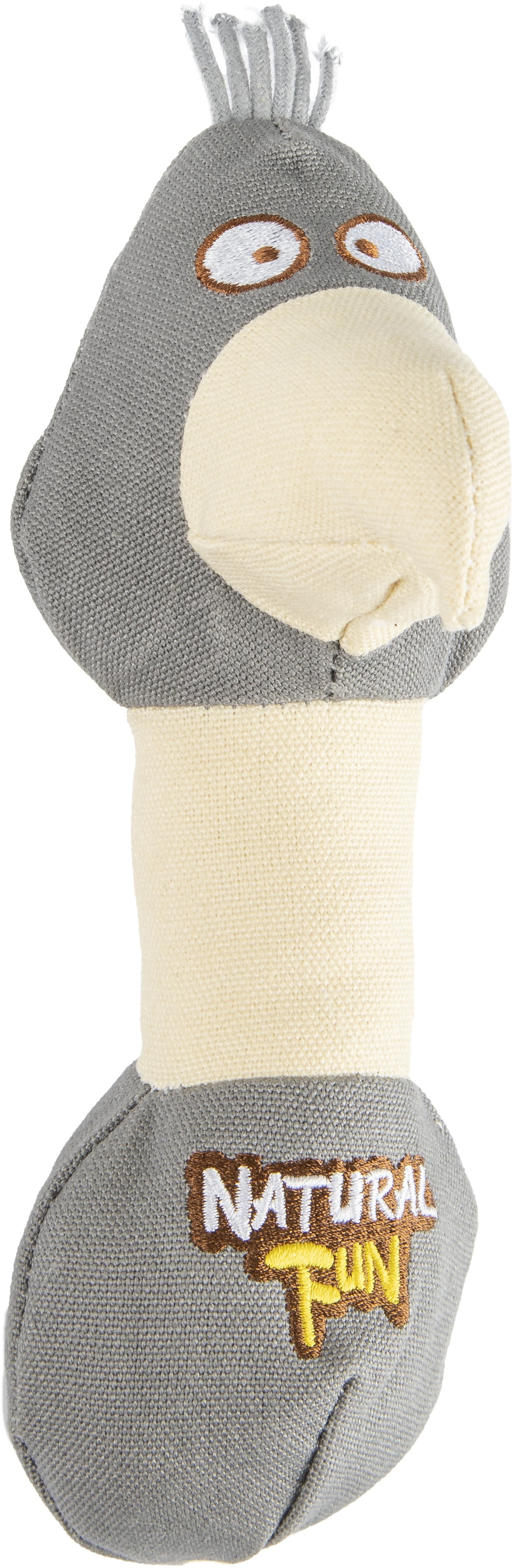 Hračka z ekologické látky GOTS pro psy ve tvaru činky s hlavou ptáka. Celý popis