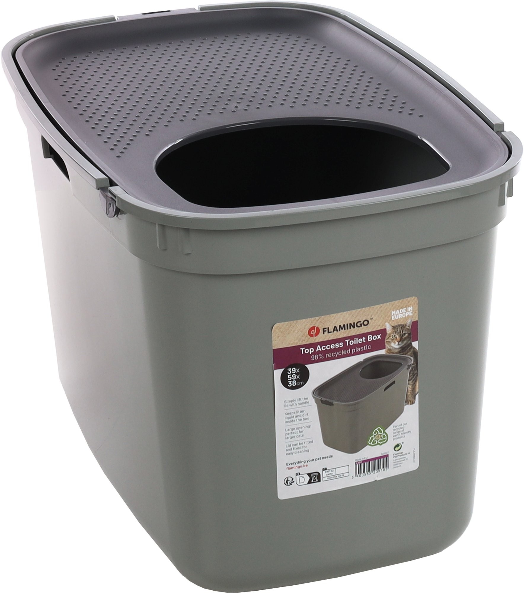 Představujeme olivově zelenou kočičí toaletu s vrchním vstupem. Je vyrobena z 98 % z recyklovaného plastu. Disponuje bezešvou základnou a boky pro zabránění úniku. Vysoký okraj zabraňuje vyhazování steliva a velký vstupní otvor zajišťuje snadné vybírání. Odnímatelné víko má integrovanou drenážní podložku a zaoblené rohy činí čištění dětskou hrou. Vyrobeno v Evropě.
