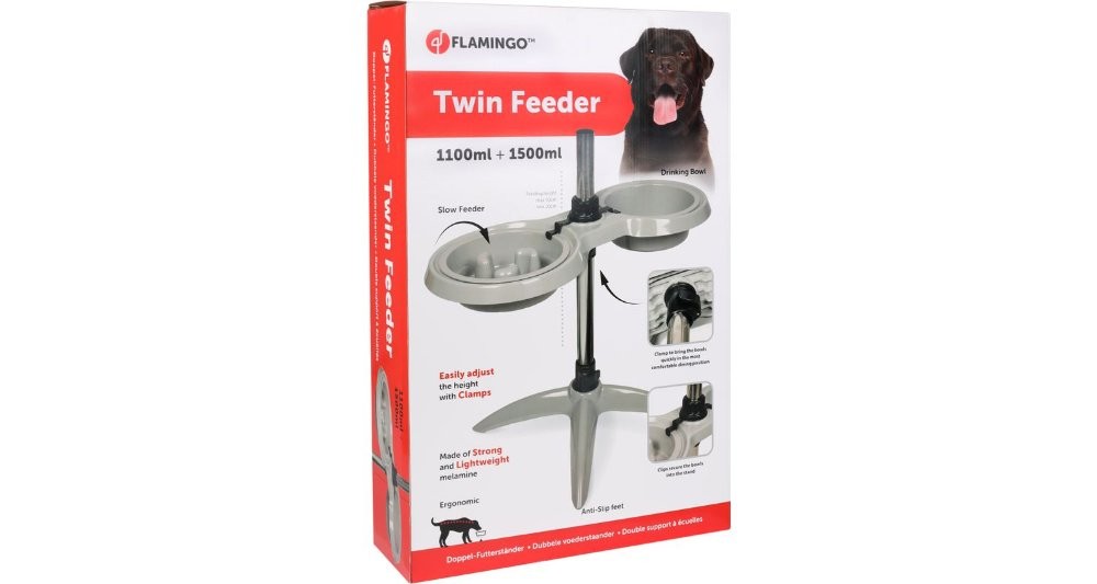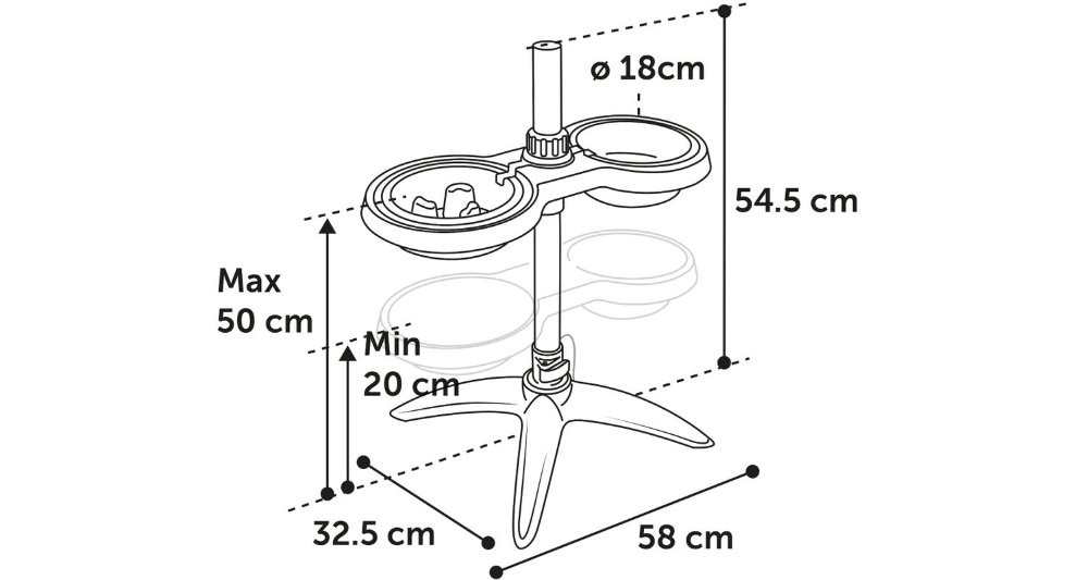 S praktickým stojanem se dvěma miskami SUVI budete mít jídlo a vodu pro svého psa vždy na jednom místě. Díky gumovým nožkám je stojan protiskluzový. Misky jsou nastavitelné až do výšky 54 cm a uchytí se pomocí rychlé svorky. Misky lze mýt v myčce. Objem misek: 1100 ml a 1500 ml