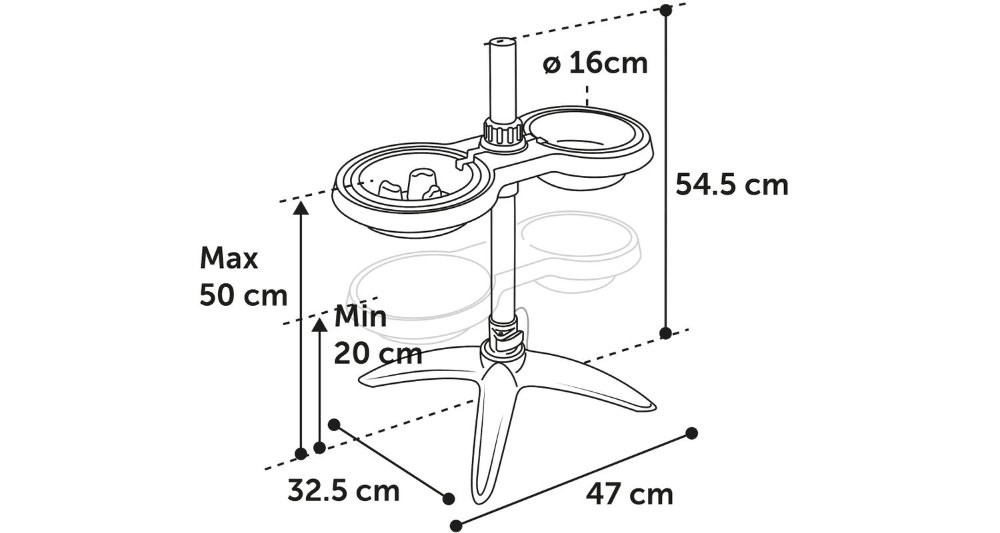 S praktickým stojanem se dvěma miskami SUVI budete mít jídlo a vodu pro svého psa vždy na jednom místě. Díky gumovým nožkám je stojan protiskluzový. Misky jsou nastavitelné až do výšky 54 cm a uchytí se pomocí rychlé svorky. Misky lze mýt v myčce. Objem misek: 600 ml a 800 ml