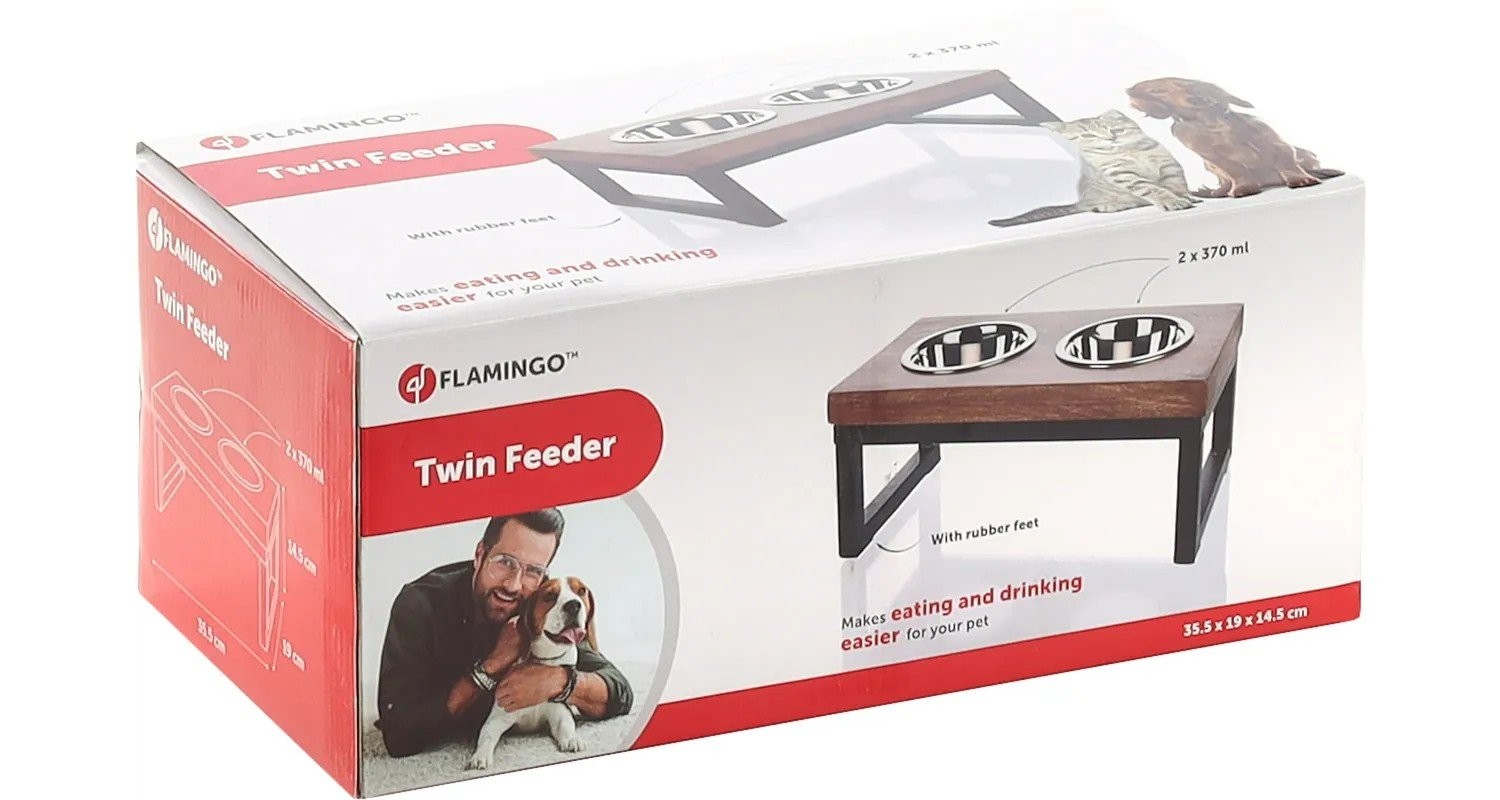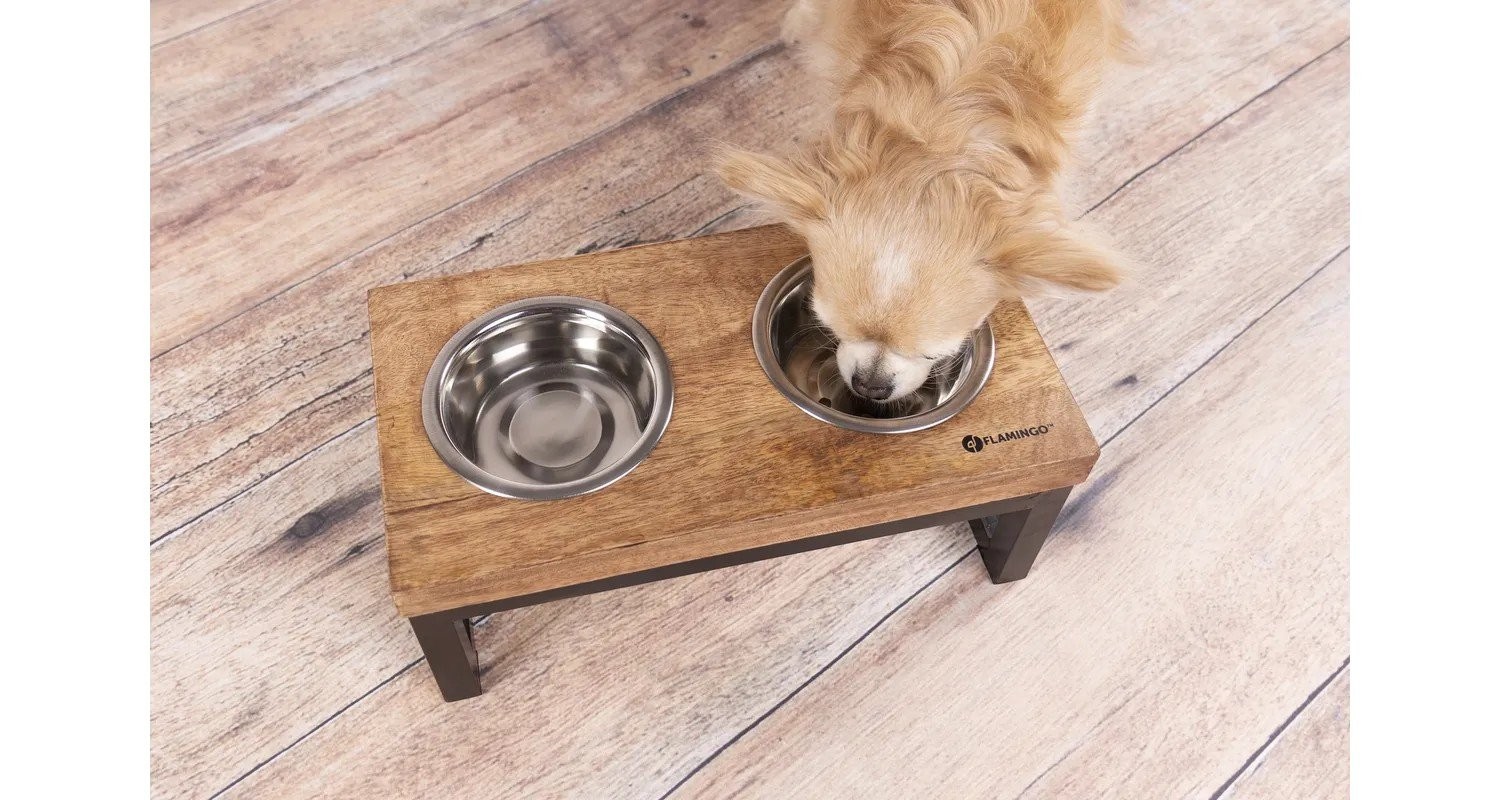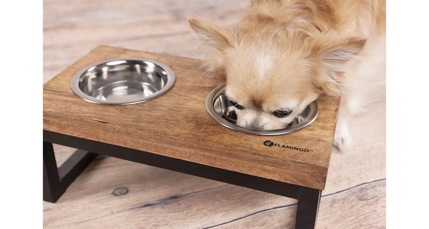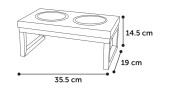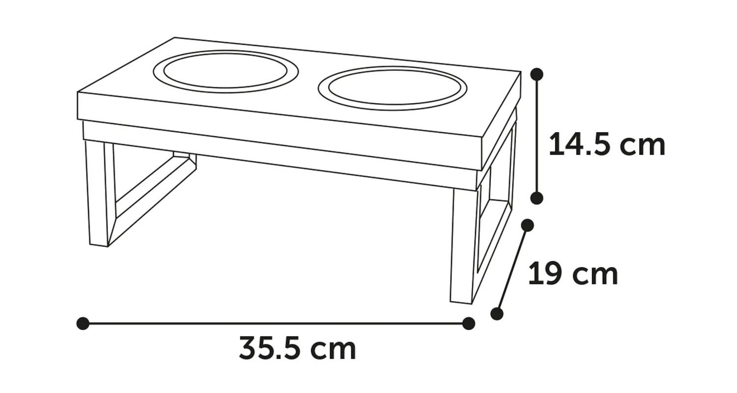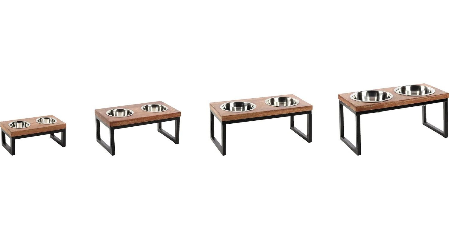 Stabilní kovová konstrukce s černou povrchovou úpravou a ochranou proti poškrábání podlahy. Deska z mangového dřeva se 2 vyjímatelnými miskami. Nerezové misky lze mýt v myčce. Pro kočky a psy všech velikostí a plemen. Určen pro vnitřní použití. Dopřejte svému věrnému čtyřnohému příteli stylový kulinářský zážitek!