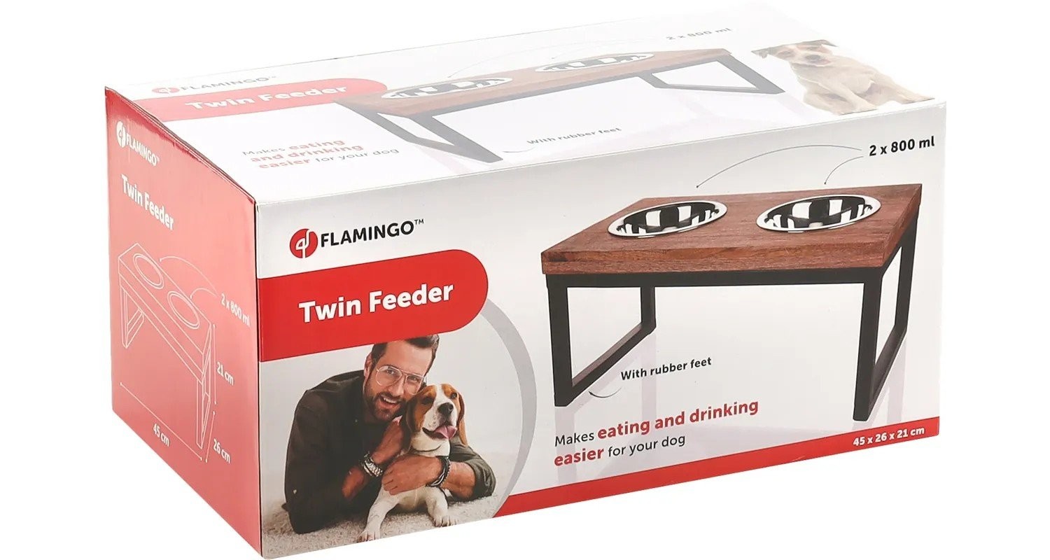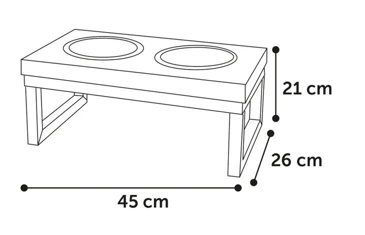 Stabilní kovová konstrukce s černou povrchovou úpravou a ochranou proti poškrábání podlahy. Deska z mangového dřeva se 2 vyjímatelnými miskami. Nerezové misky lze mýt v myčce. Pro kočky a psy všech velikostí a plemen. Určen pro vnitřní použití. Dopřejte svému věrnému čtyřnohému příteli stylový kulinářský zážitek!