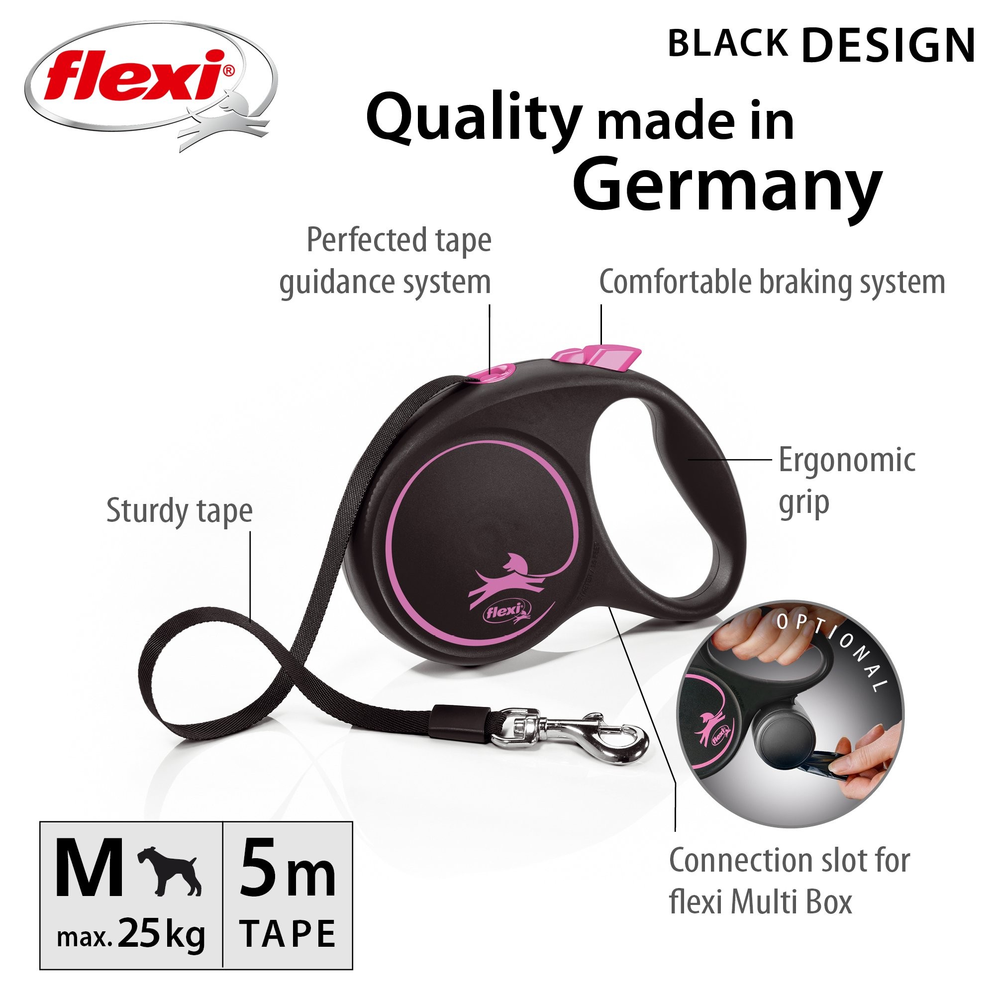 Černá je zpět! Vodítko z řady flexi® Black Design upoutá pozornost na první pohled. Výrazné barvy elegantně kontrastují s černým pouzdrem. Moderní design lze zároveň kombinovat s praktickými doplňky flexi®.
