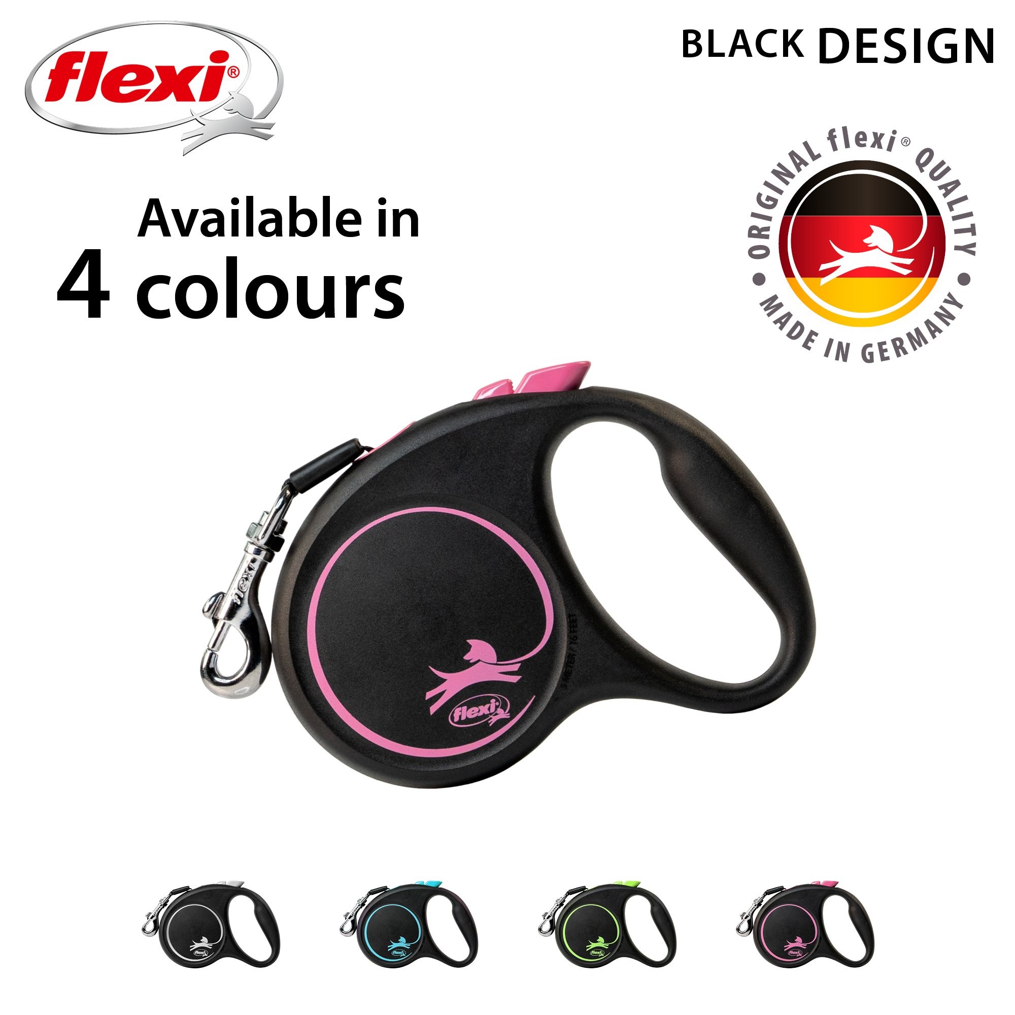 Černá je zpět! Vodítko z řady flexi® Black Design upoutá pozornost na první pohled. Výrazné barvy elegantně kontrastují s černým pouzdrem. Moderní design lze zároveň kombinovat s praktickými doplňky flexi®.