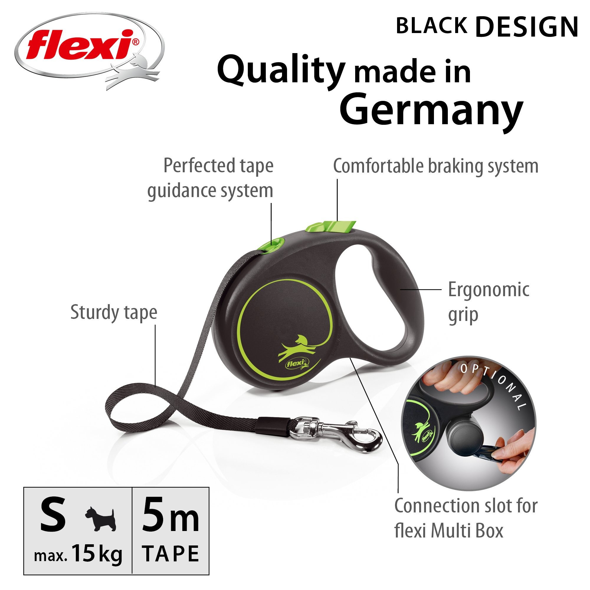 Černá je zpět! Vodítko z řady flexi® Black Design upoutá pozornost na první pohled. Výrazné barvy elegantně kontrastují s černým pouzdrem. Moderní design lze zároveň kombinovat s praktickými doplňky flexi®.
