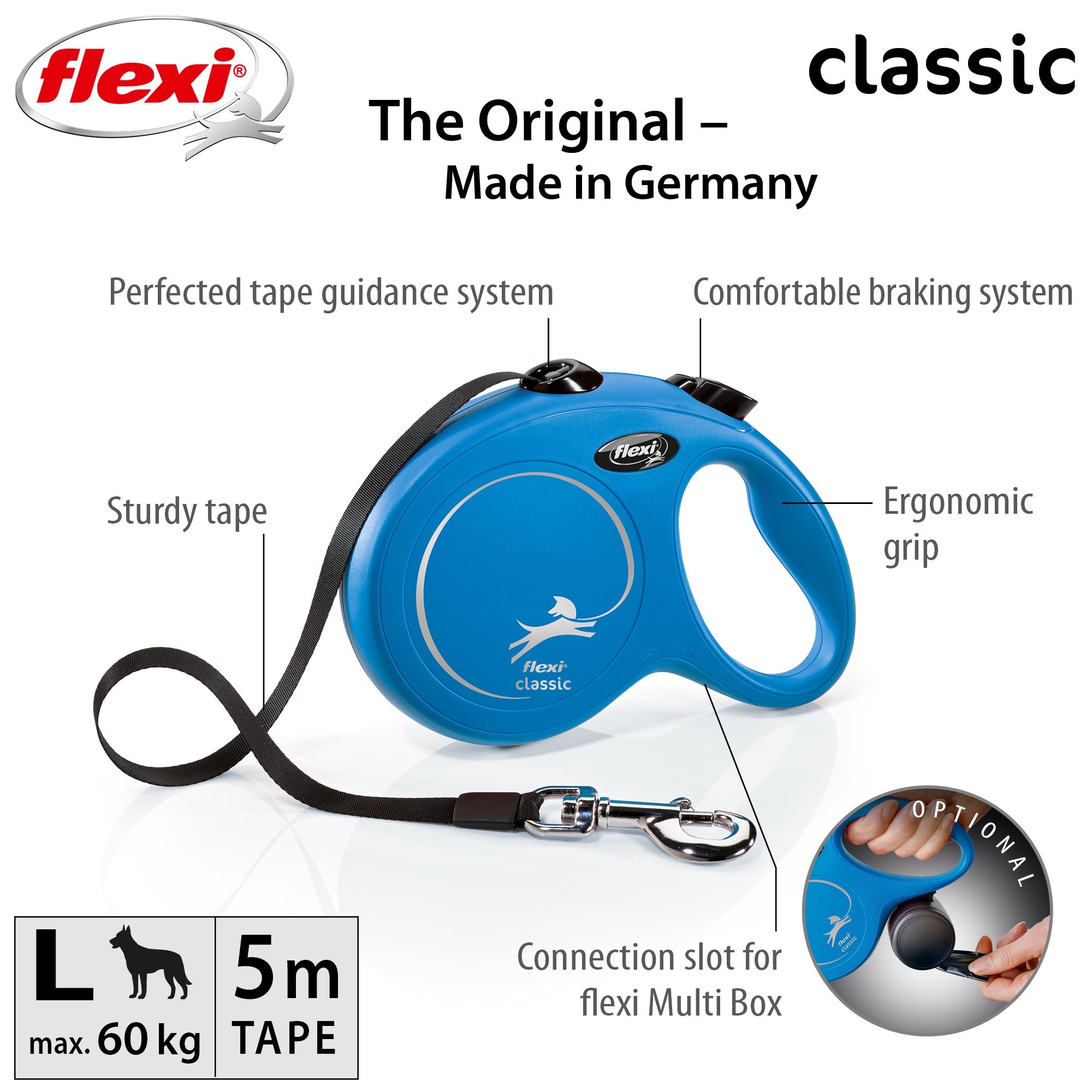 Vodítka flexi® classic nabízí pohodlný úchop, odolný navíjecí systém i kvalitní, bezpečný a intuitivní brzdový systém, který ve zlomku vteřiny zastaví pohyb psa. Pro snadné upevnění vodítka k obojku nebo postroji je vodítko opatřeno chromovanou karabinou. Samozřejmostí je zdokonalený výstup pásku, který zajišťuje manipulaci v libovolném směru bez zasekávání - potvrzeno nesčetnými testy.