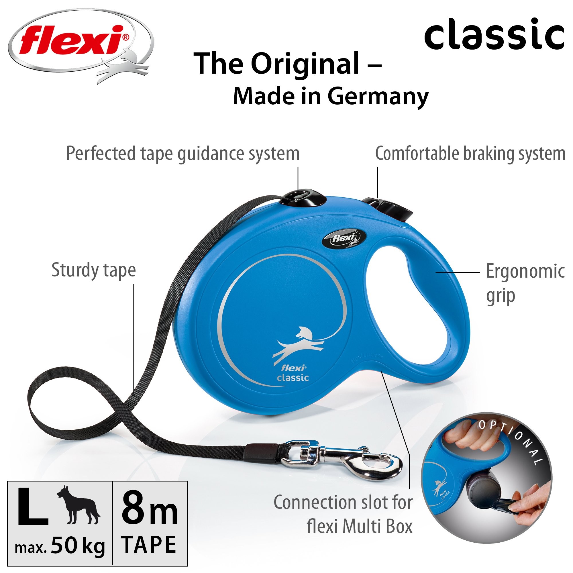 Vodítka flexi® classic nabízí pohodlný úchop, odolný navíjecí systém i kvalitní, bezpečný a intuitivní brzdový systém, který ve zlomku vteřiny zastaví pohyb psa. Pro snadné upevnění vodítka k obojku nebo postroji je vodítko opatřeno chromovanou karabinou. Samozřejmostí je zdokonalený výstup pásku, který zajišťuje manipulaci v libovolném směru bez zasekávání - potvrzeno nesčetnými testy.