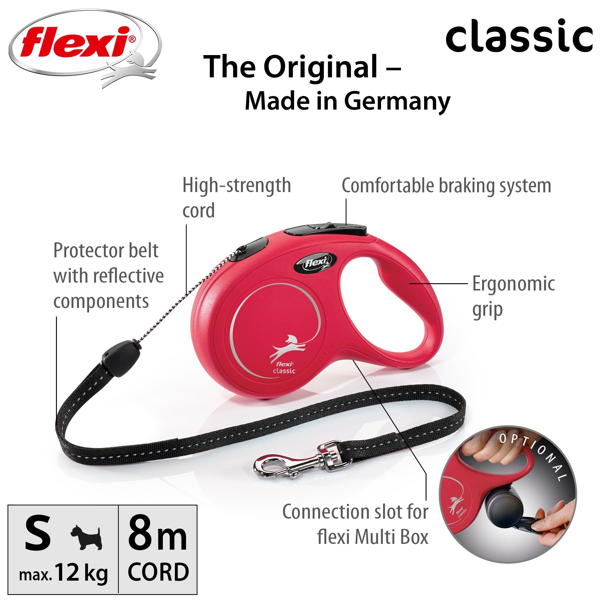 Vodítka flexi® classic nabízí pohodlný úchop, odolný navíjecí systém i kvalitní, bezpečný a intuitivní brzdový systém, který ve zlomku vteřiny zastaví pohyb psa. Pro snadné upevnění vodítka k obojku nebo postroji je vodítko opatřeno chromovanou karabinou.